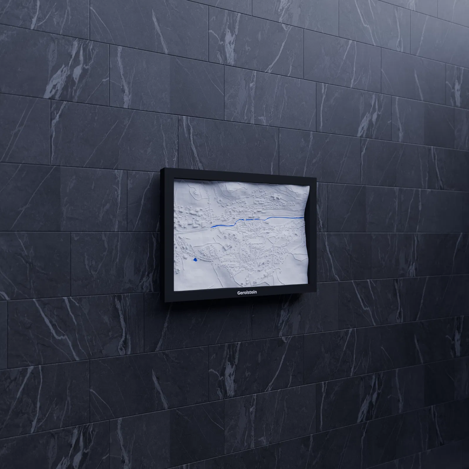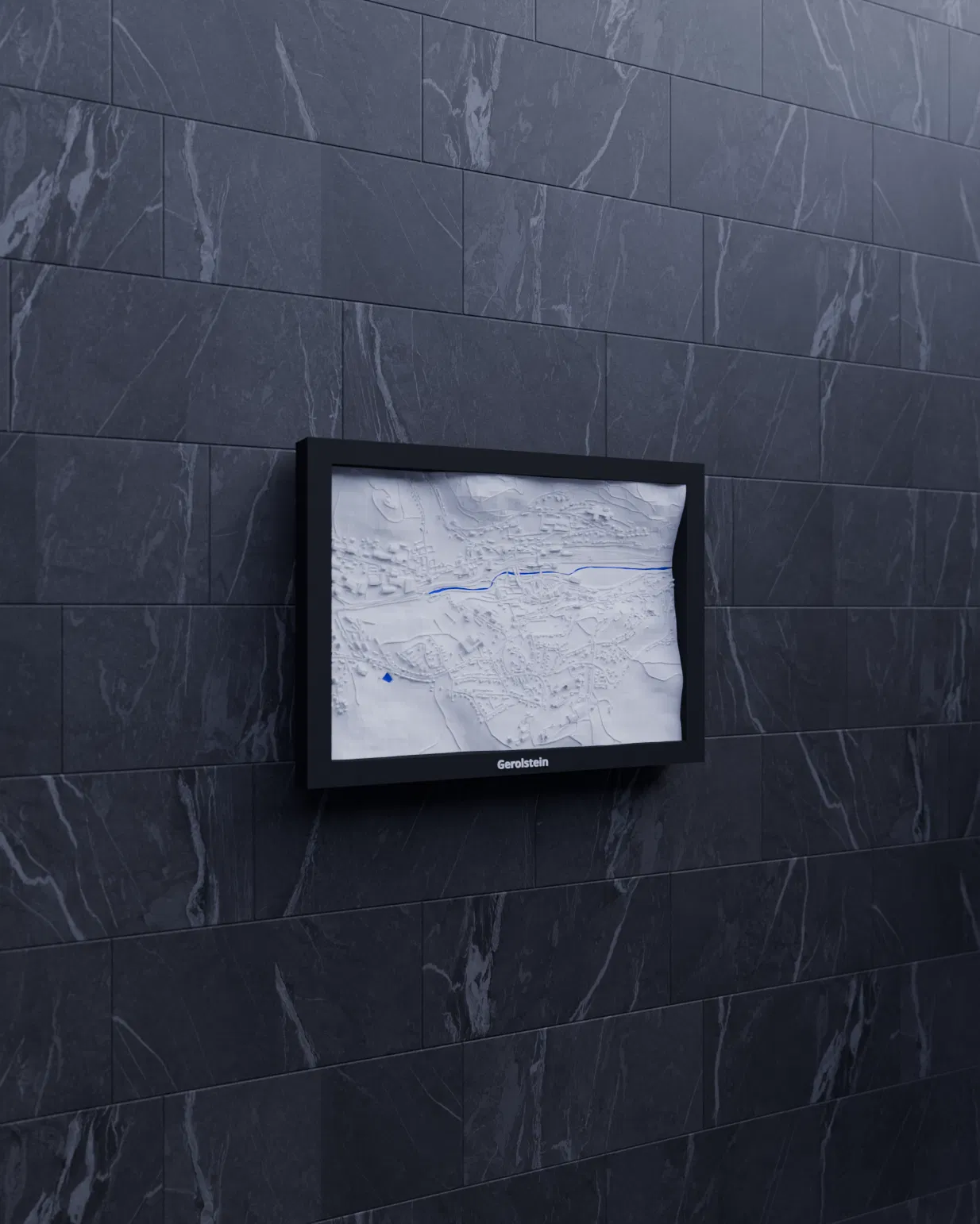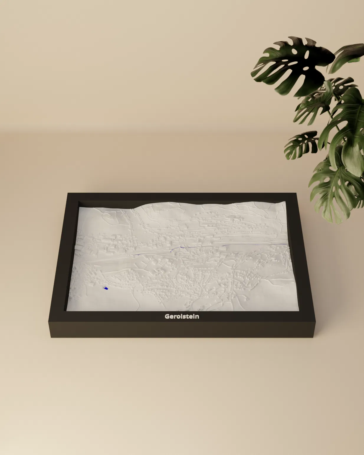 Miniature địa hình 3D của Gerolstein (Đức), dựng từ dữ liệu địa lý cho terrain chân thật. Thu nhỏ từ 2.050×1.433 km xuống 170.5×119.5 mm (xấp xỉ 12025:1), kèm nhiều lựa chọn frame và print profile.