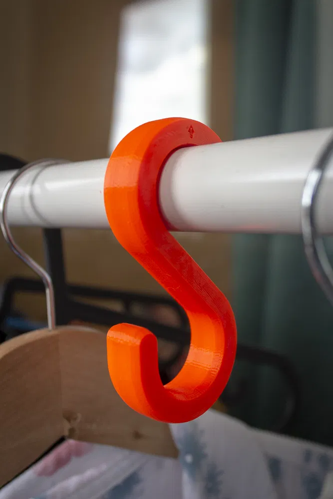 Móc chữ S đơn giản nhưng rất chắc, in nhanh và dễ. Cạnh vát giúp ra mặt đẹp ngay lần in đầu, không làm sờn hay rách vải. Hợp để treo khăn, quần áo, túi xách… dùng trong nhà bếp, phòng giặt hoặc phòng tắm.