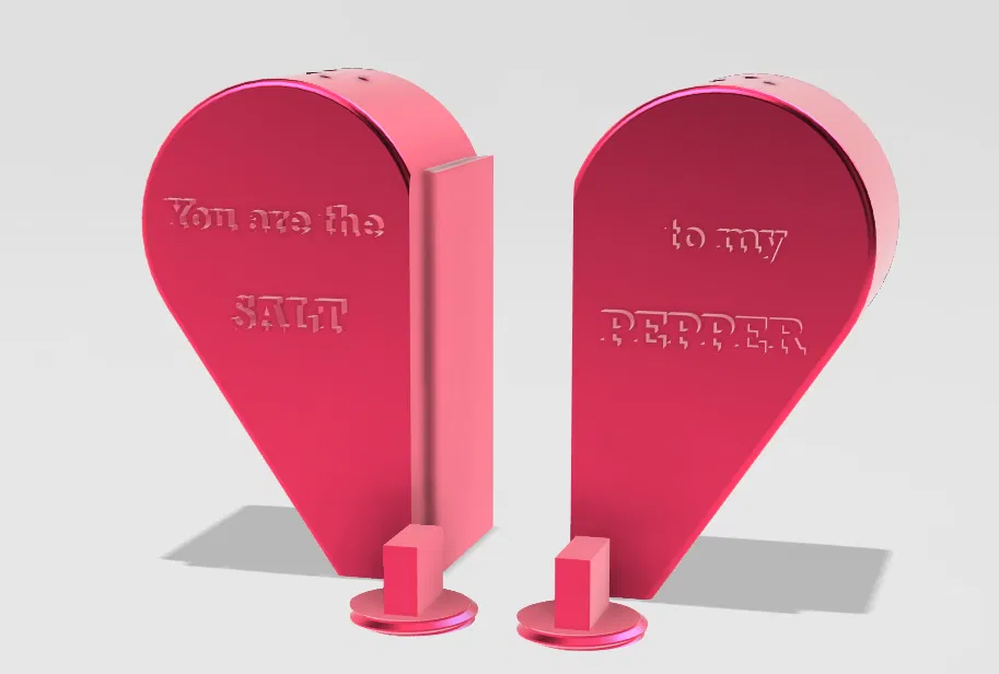 Bộ lắc muối & tiêu hình trái tim dành cho các cặp đôi, có thể gắn dính vào nhau. Trên mẫu có câu “You are the SALT to my PEPPER”. Dễ in với PLA, không cần supports, châm lại qua lỗ phía sau.