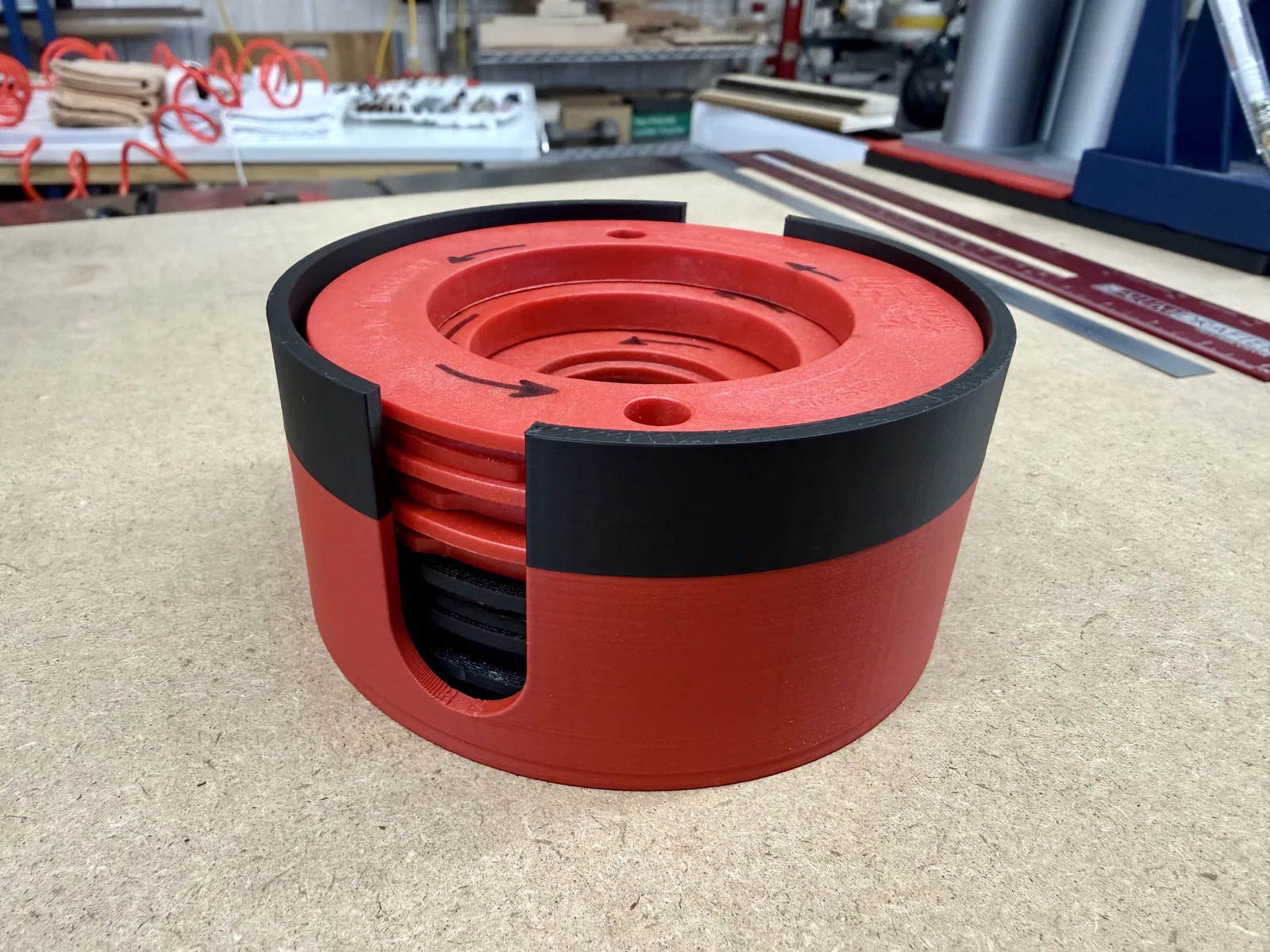 Khay/giá đỡ này chứa được tối đa 6 insert cho JessEm 02310 Rout-R-Lift II. Mục tiêu của mình là: a) giảm bớt diện tích chiếm trên mặt bàn làm việc và b) gom mấy miếng nhỏ trơn tuột này về chung một chỗ cho khỏi thất lạc…! Mình cũng làm thêm các khe ở bên hông để dễ móc/lấy insert ra hơn.