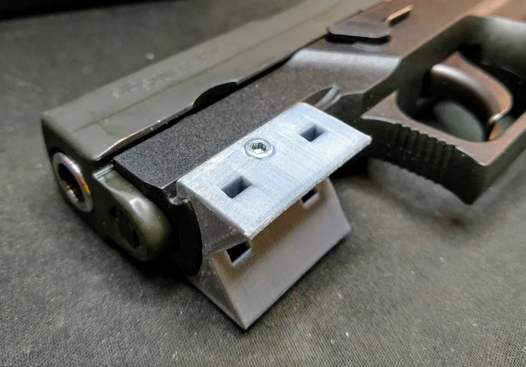 Mình không tìm được cái mount nào ngon mà vừa với khẩu Sig Sauer P250 của mình—cái rail của nó gần như chuẩn NATO nhưng hơi khác một chút. Mình cũng muốn làm một món cho phép in ra vài cái theo nhiều cỡ đèn khác nhau, và có thể đổi đèn dễ dàng chỉ với vài sợi dây rút (zip tie).