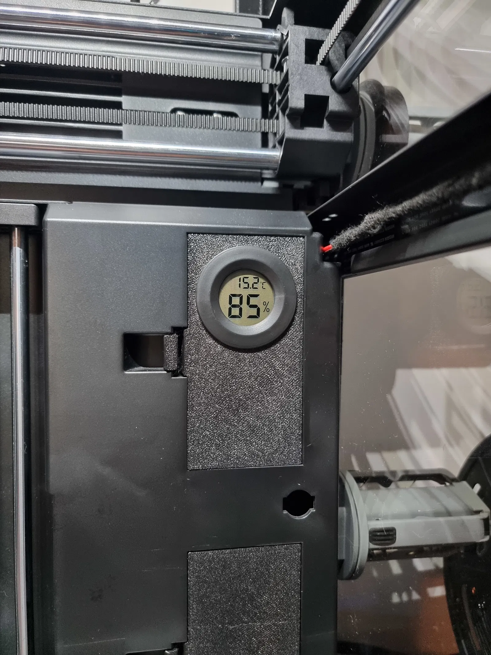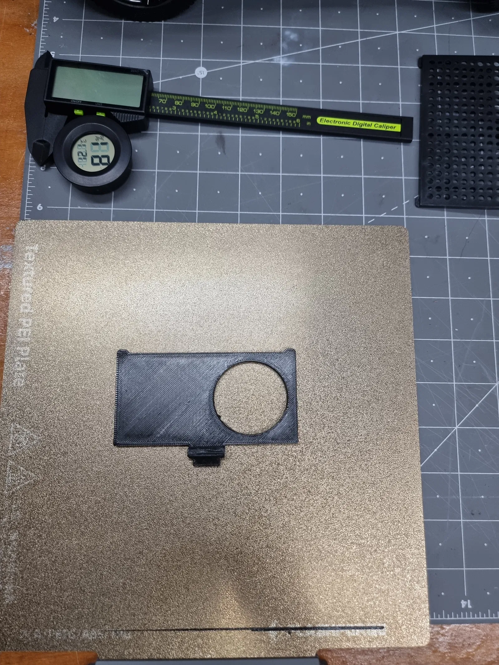 Mình muốn có một miếng kín để lấp phần vent cover đang trống nhằm giúp giữ nhiệt và hạn chế khói/mùi thoát ra, nhưng cũng muốn có chỗ để gắn cảm biến nhiệt độ & độ ẩm, nên mình làm cái này cho tiện. Mình làm lỗ 41.5mm, vừa khá khít với cảm biến nhiệt độ/độ ẩm mình mua trên AliExpress (hình như 41.5mm–42mm là kích thước phổ biến của mấy Digital Hygrometers này). Mình phải chà nhám nhẹ phần lỗ để loại bỏ bavia/nhựa thừa, nhờ vậy cảm biến lắp vào ngon lành.