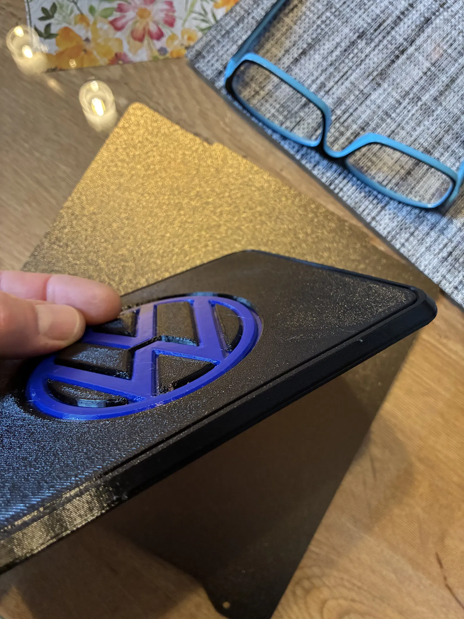 Do thảm lót sàn trong chiếc Golf của ba mình bị giày dép làm hư hại nên mình thiết kế cái miếng bảo vệ (Schoner) này. Mẫu được in 2 phần. Phần trong in trước bằng PETG (dùng làm gia cường chống bị đạp thủng nên chọn PETG), có logo ở mặt trên. Sau đó in phần vỏ bao quanh với mặt có logo úp xuống. Ngay trước lớp top (Deckschicht) thì cho máy tạm dừng, trong lúc dừng mình đặt phần trong dùng để gia cường vào, nhờ vậy nó được tích hợp luôn vào chi tiết.