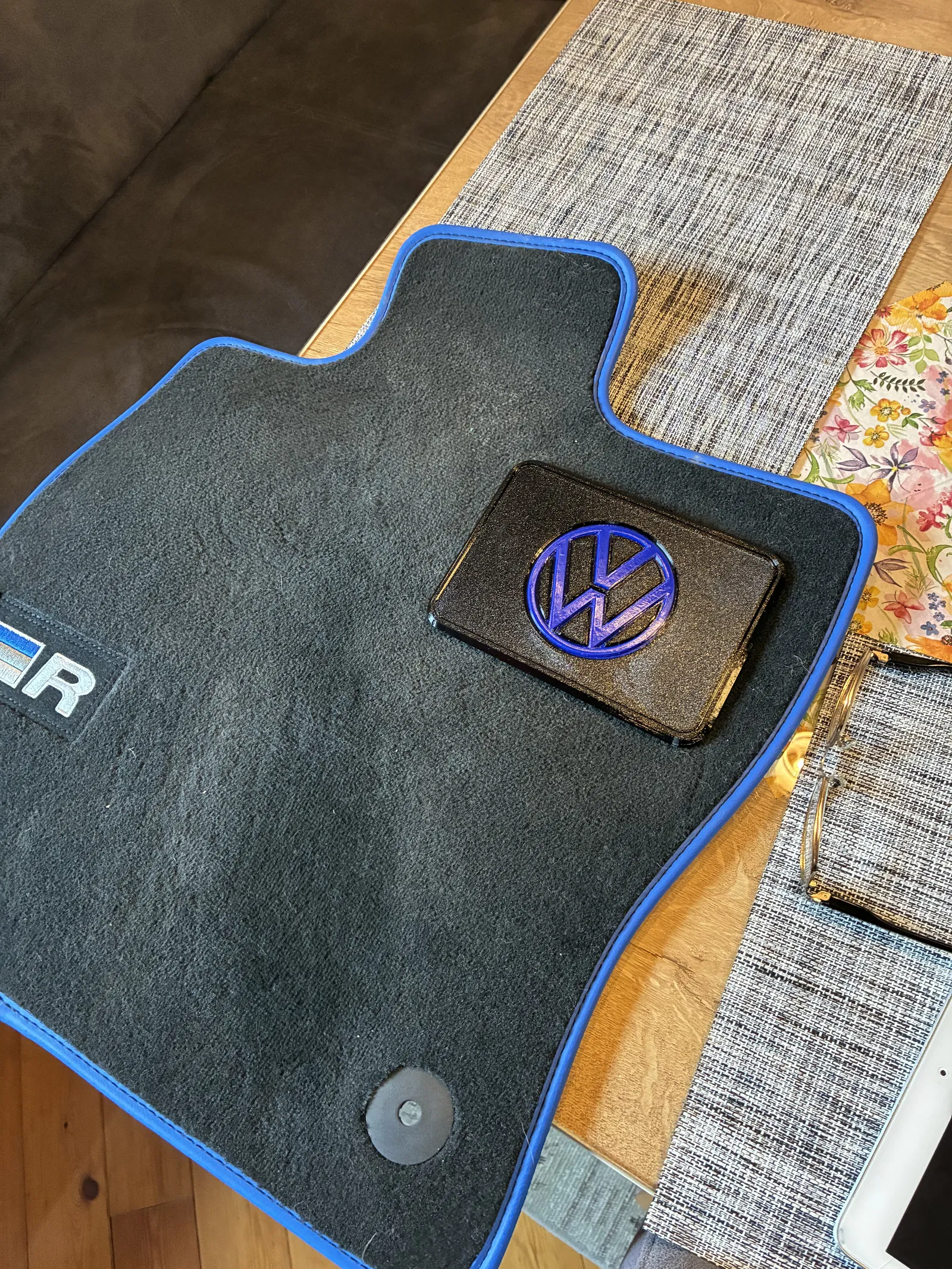 Miếng gia cường cho thảm lót sàn (Fussmattenschoner) trên VW Golf: in 2 phần, lõi PETG có logo để chống đạp thủng, rồi in vỏ úp logo xuống và tạm dừng trước lớp top để đặt lõi vào, tích hợp trực tiếp.