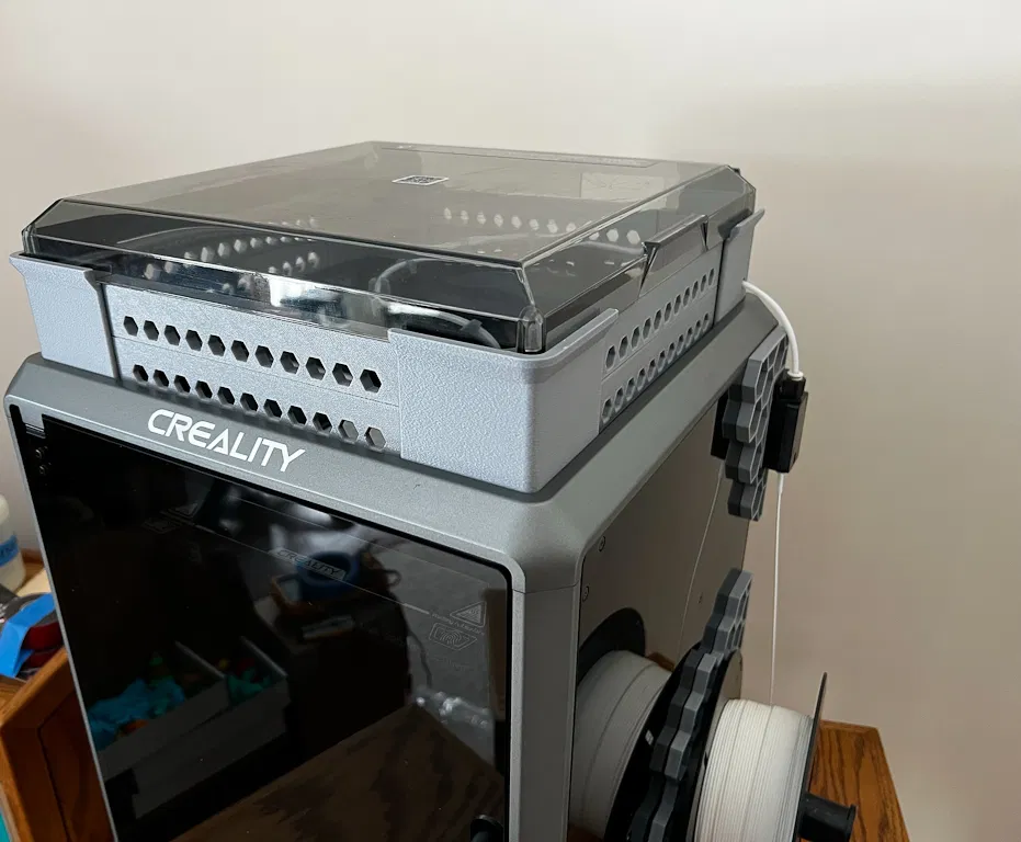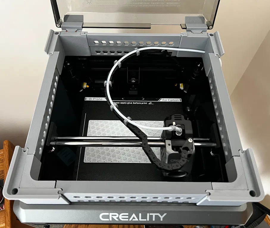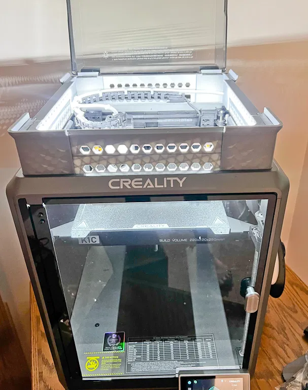 Lớn tuổi rồi nên tôi cần thêm ánh sáng để nhìn vào cái “hang tối” bên trong K1C. Ban đầu tôi lắp cái hinged lid rất hay của Joe Cooper để dễ thao tác khi thay filament. Khi tính chuyện gắn thêm LED light strips ở đâu cho hợp lý, tôi nhận ra cách duy nhất là đưa lên cao.