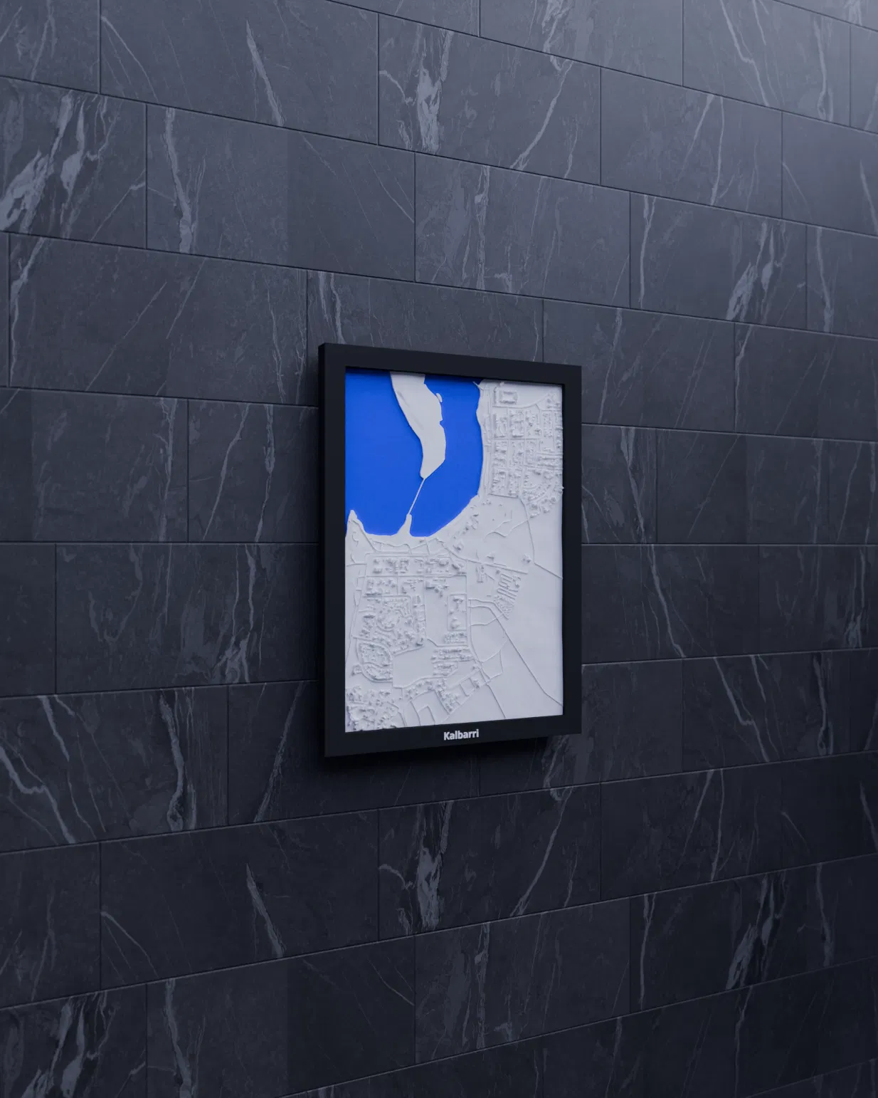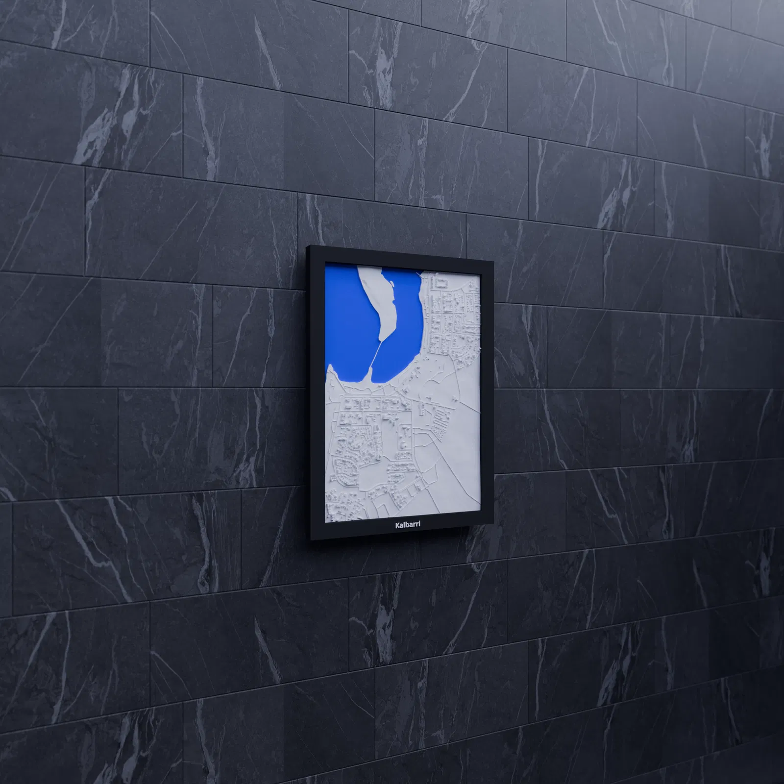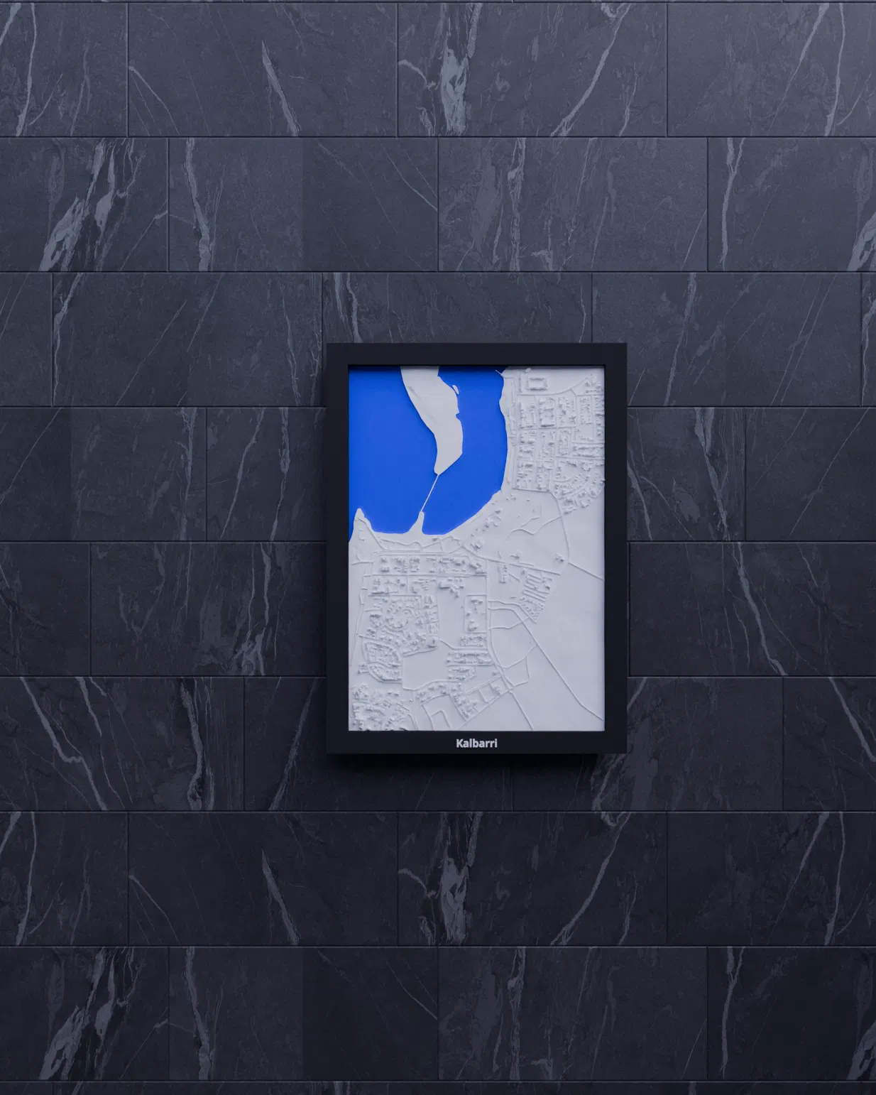 Mô hình địa hình thu nhỏ Kalbarri (Australia) in 3D từ dữ liệu địa lý, tái hiện terrain chân thực. Khu vực 1.566 × 2.223 km được thu về kích thước 119.5 × 170.5 mm, tỉ lệ ~13108:1, kèm các phiên bản khung treo.