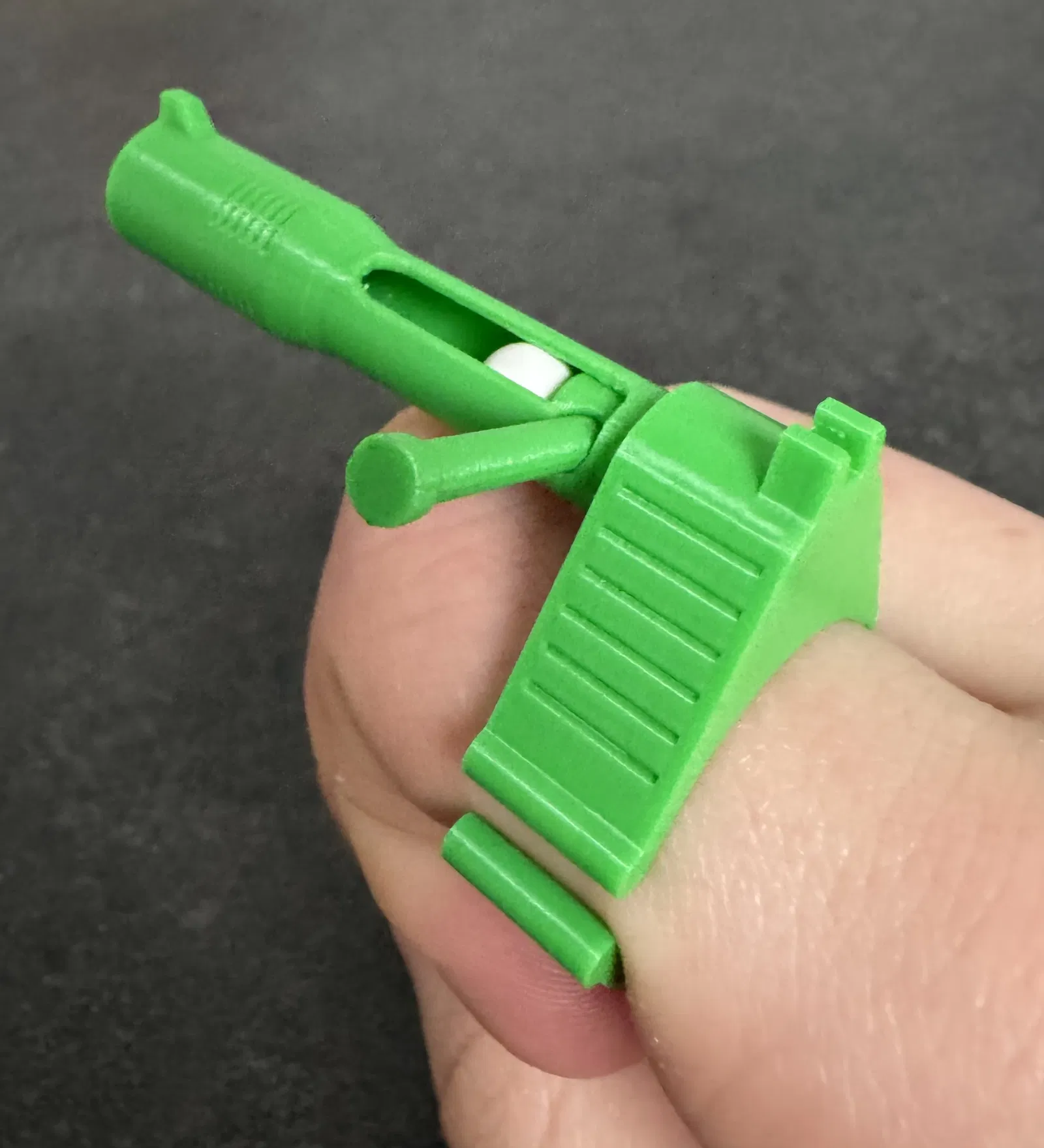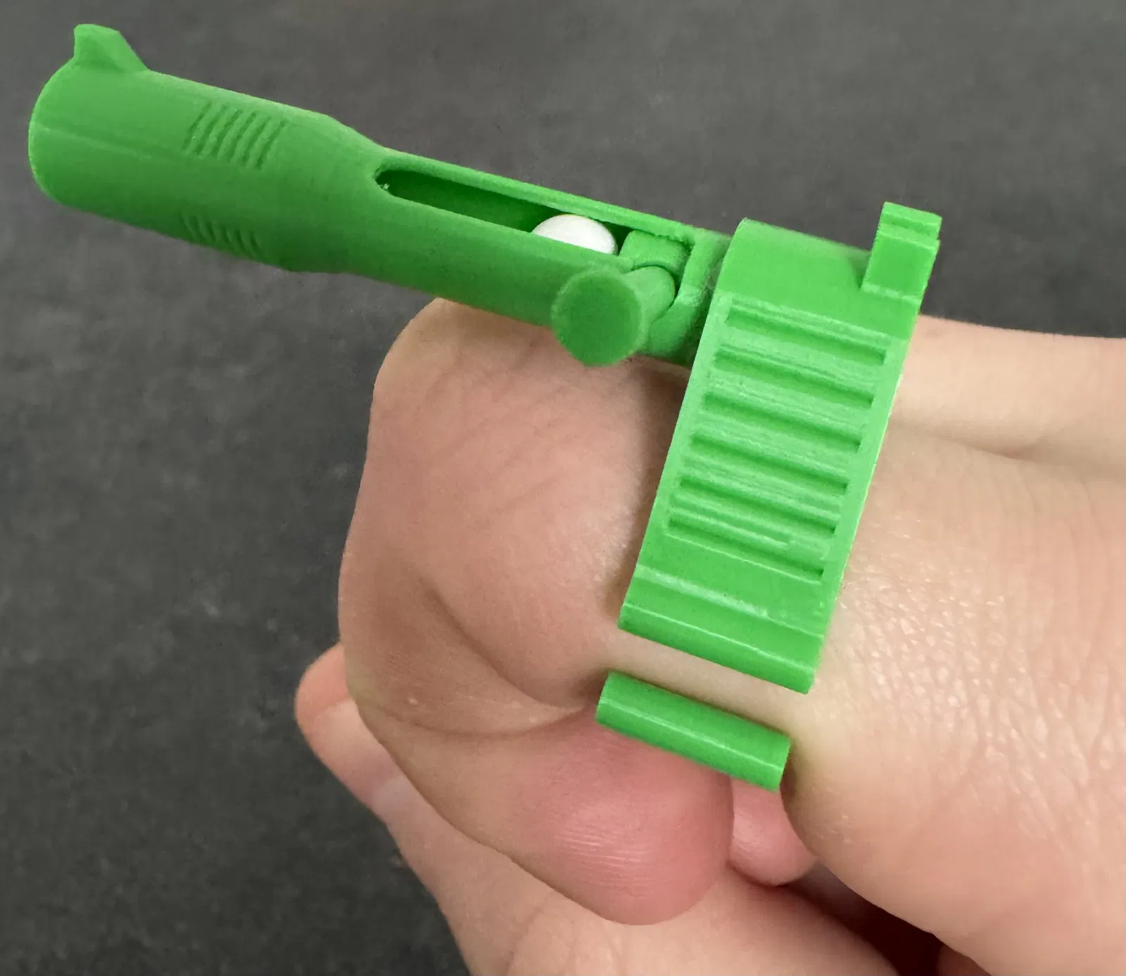 Mini Finger Gun là launcher nhỏ gắn trên ngón tay, bắn đạn airsoft BB 6mm bằng lò xo lấy từ bút bi thường. Thiết kế tối ưu để 3D print không cần supports, in tốt với PLA hoặc PETG; lực bắn tùy lò xo.