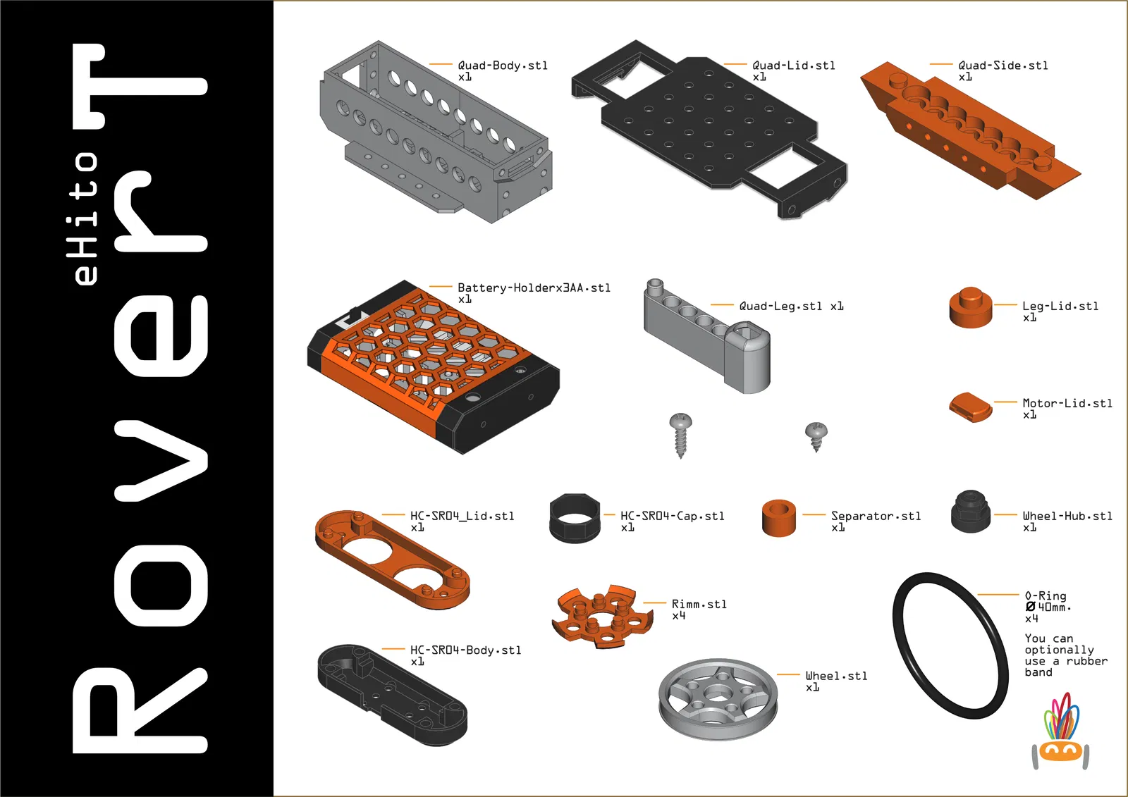 RoverT là dự án robot Arduino miễn phí: né vật cản bằng proximity sensor, bật LED khi trời tối nhờ light sensor, và tự đổi hướng ngẫu nhiên. In 3D dễ, không cần supports, khuyến nghị layer 0.2 mm.
