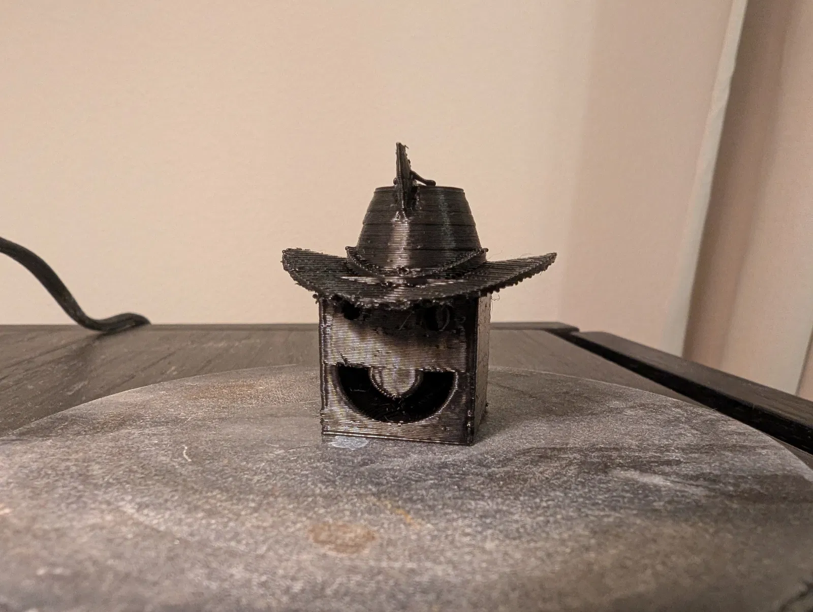 Đây là một khối lập phương vui nhộn đội nón cao bồi. Khi in nhớ bật supports. Phần vành nón (brim) là tuỳ chọn.