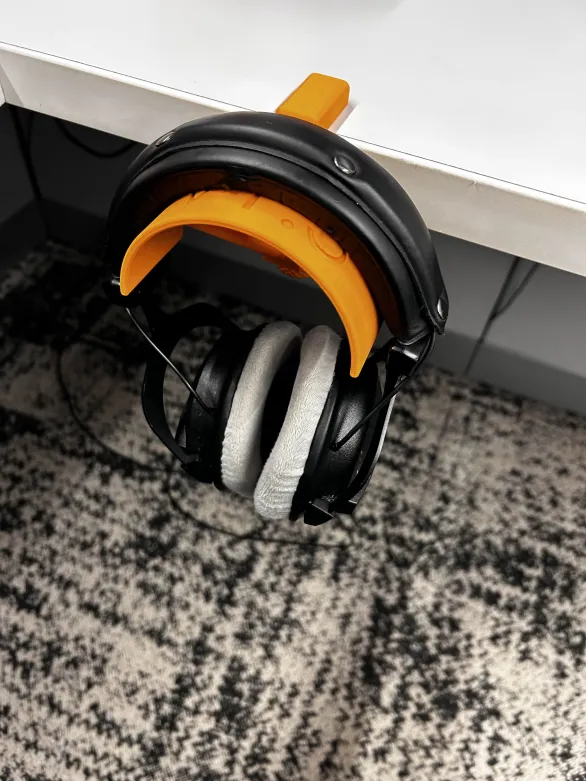 Giá treo tai nghe kẹp mép bàn nhỏ gọn, lắp nhanh không cần khoan. Phần cradle cong đỡ đều headband để giảm hằn, kẹp bằng vít ren + pressure plate, chỉnh được nhiều độ dày bàn. Dễ 3D print và lắp ráp.