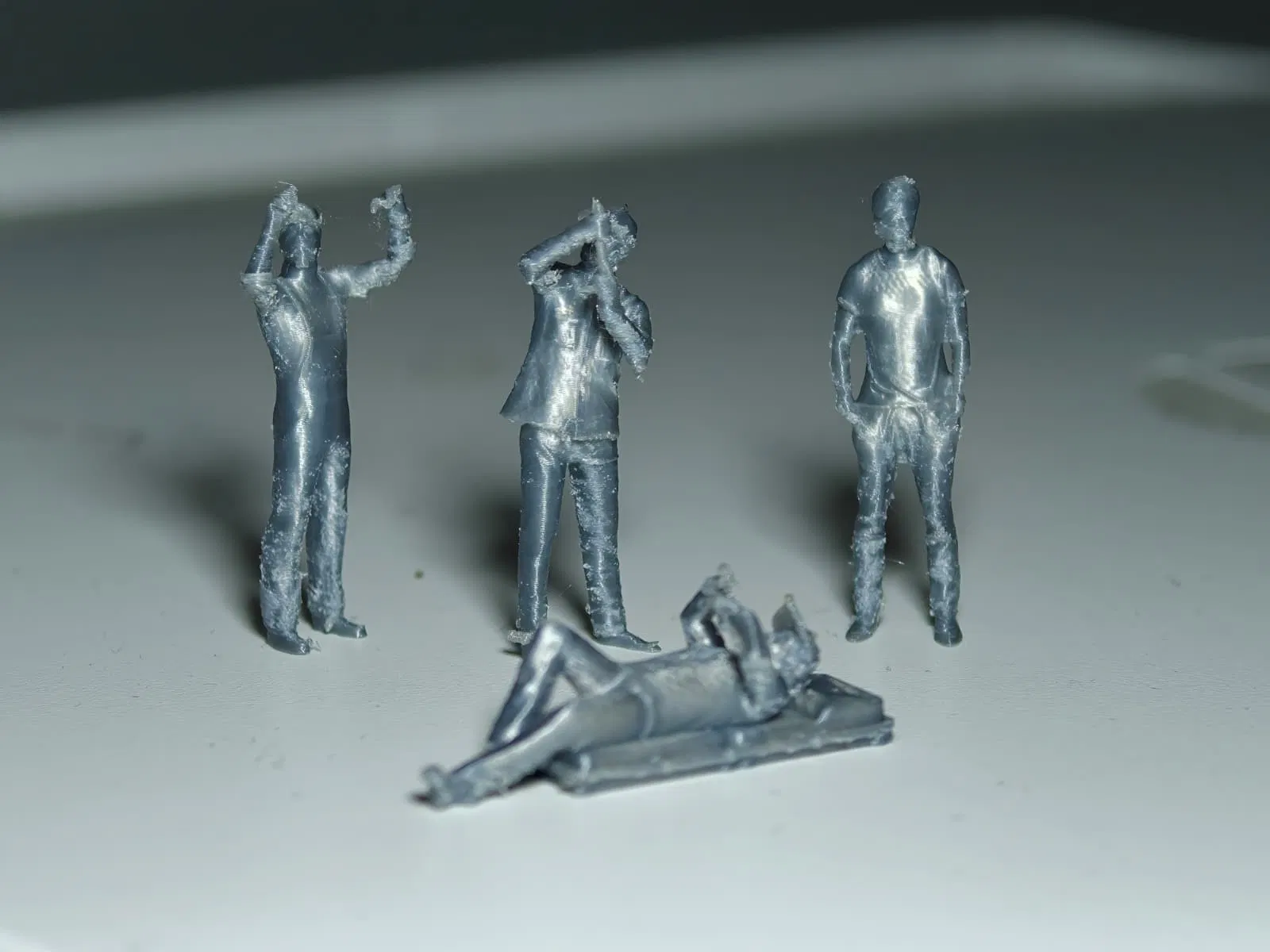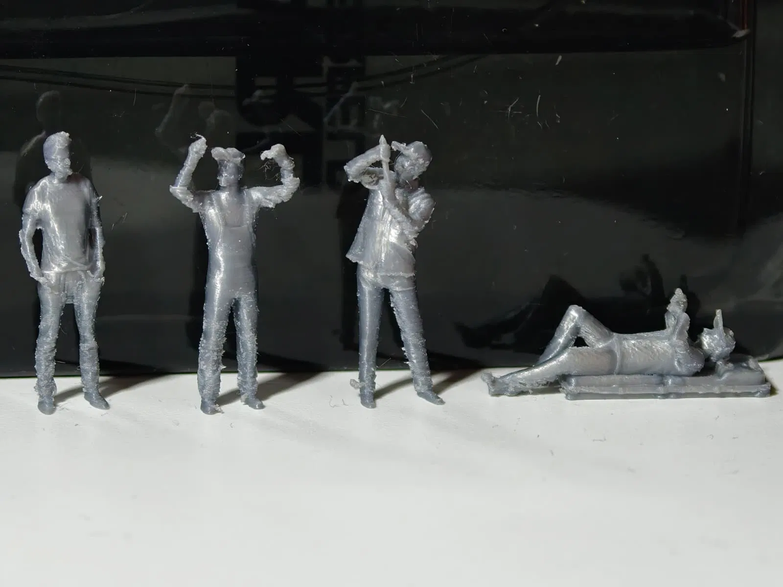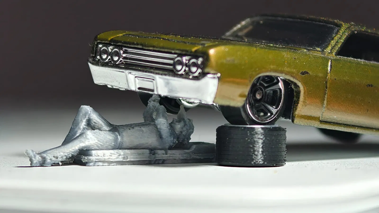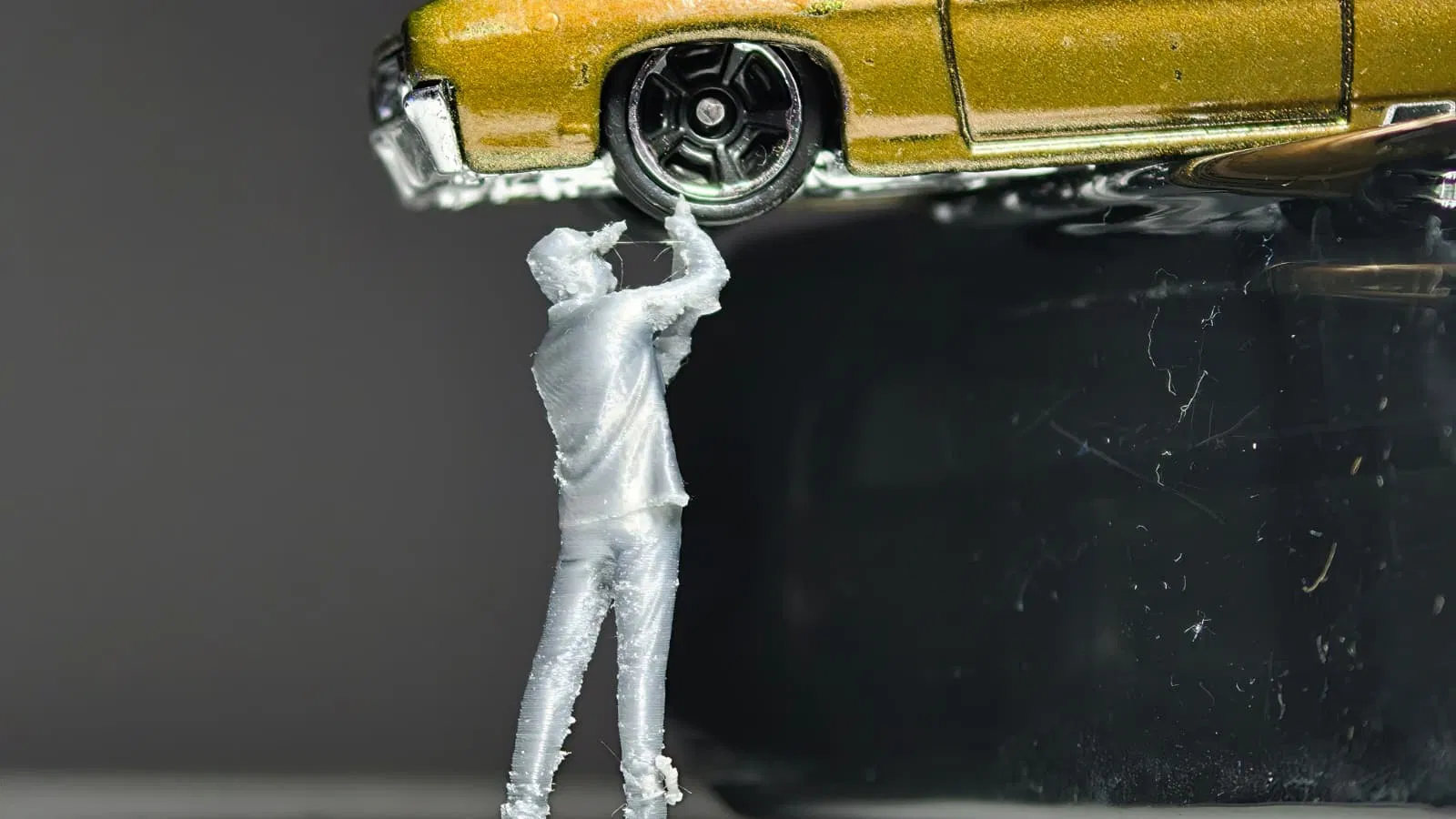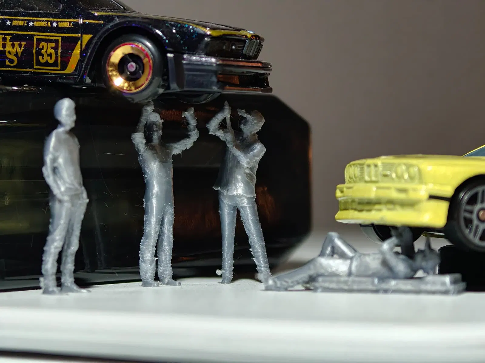 Bộ figure thợ máy garage mini tỉ lệ 1/64 dành cho diorama xe diecast như Hot Wheels/Matchbox. Mẫu nhiều chi tiết, có thể upscale lên 1/43 hoặc 1/24; khuyến nghị nozzle 0.2mm, layer 0.06mm và cần supports.