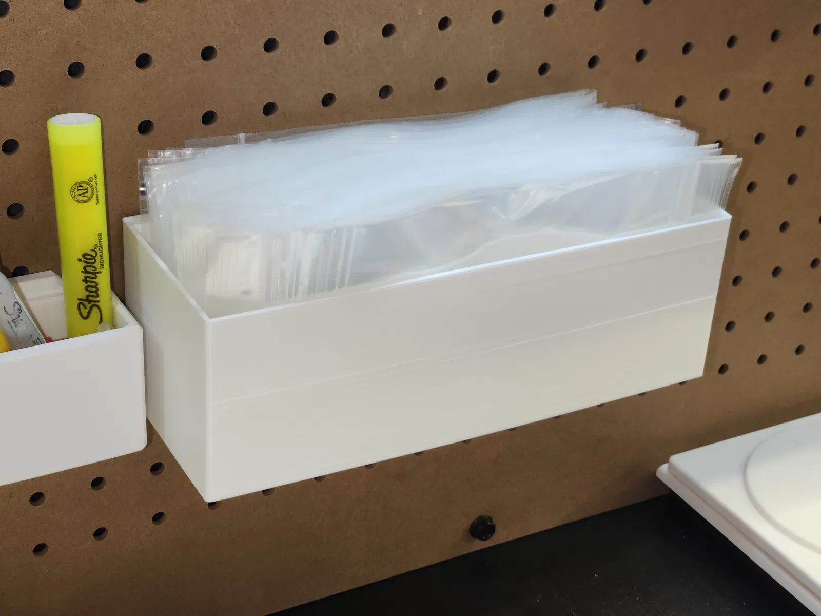 Hộp dài cỡ lớn cho Sy's Peglock, thiết kế để đựng hàng trăm túi zip-lock 4x6. Thể tích trong thực tế ~8.8" rộng x 3" sâu x gần 3" cao, vừa trong khoảng 9". In không cần supports; lưu ý chống warping.