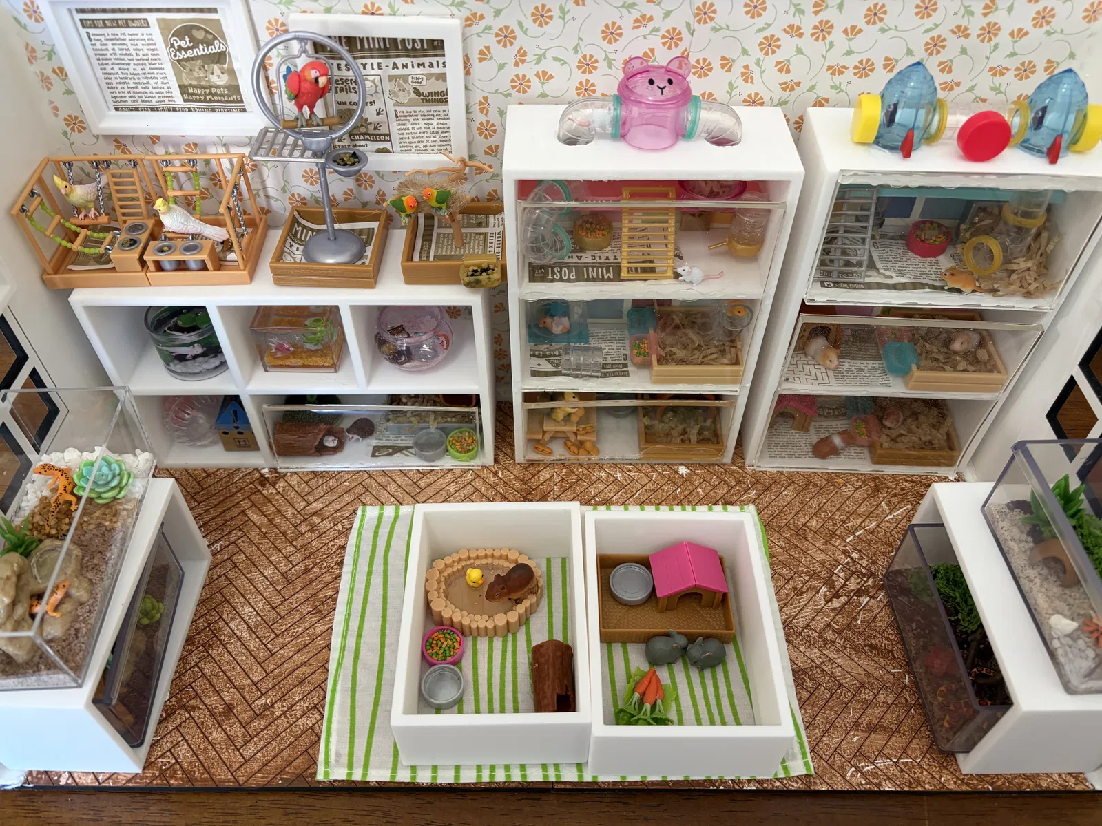 Bộ kệ mini dành cho mô hình cửa hàng thú cưng, lấy cảm hứng từ MGA Miniverse Make It Mini Animals. Gồm 4 kiểu kệ khác nhau, có cả kệ cao với lỗ để lắp ống hamster.