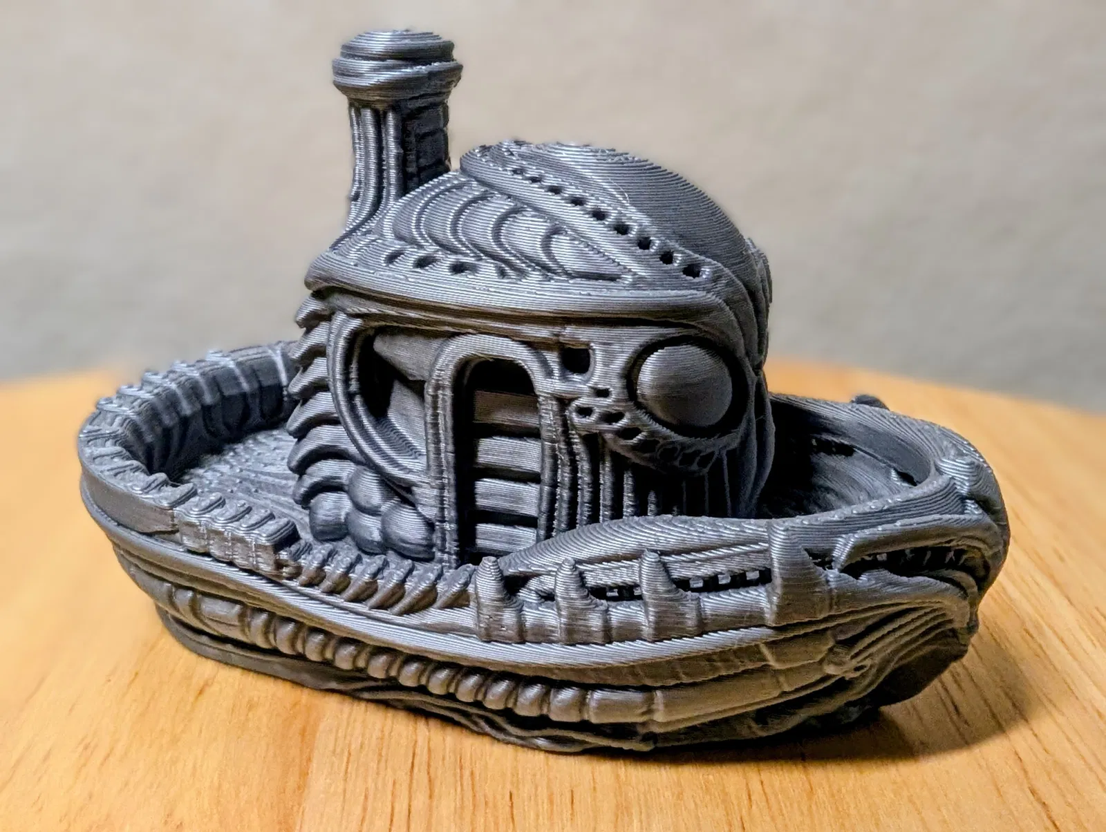 Xeno Benchy - No Supports mang DNA benchy cổ điển pha chất alien từ không gian sâu. Thân tàu quấn gân sườn biomechanical, mũi tàu như hàm săn mồi, cabin thành sọ alien—hợp trưng bàn/kệ và làm test print đẹp mắt.