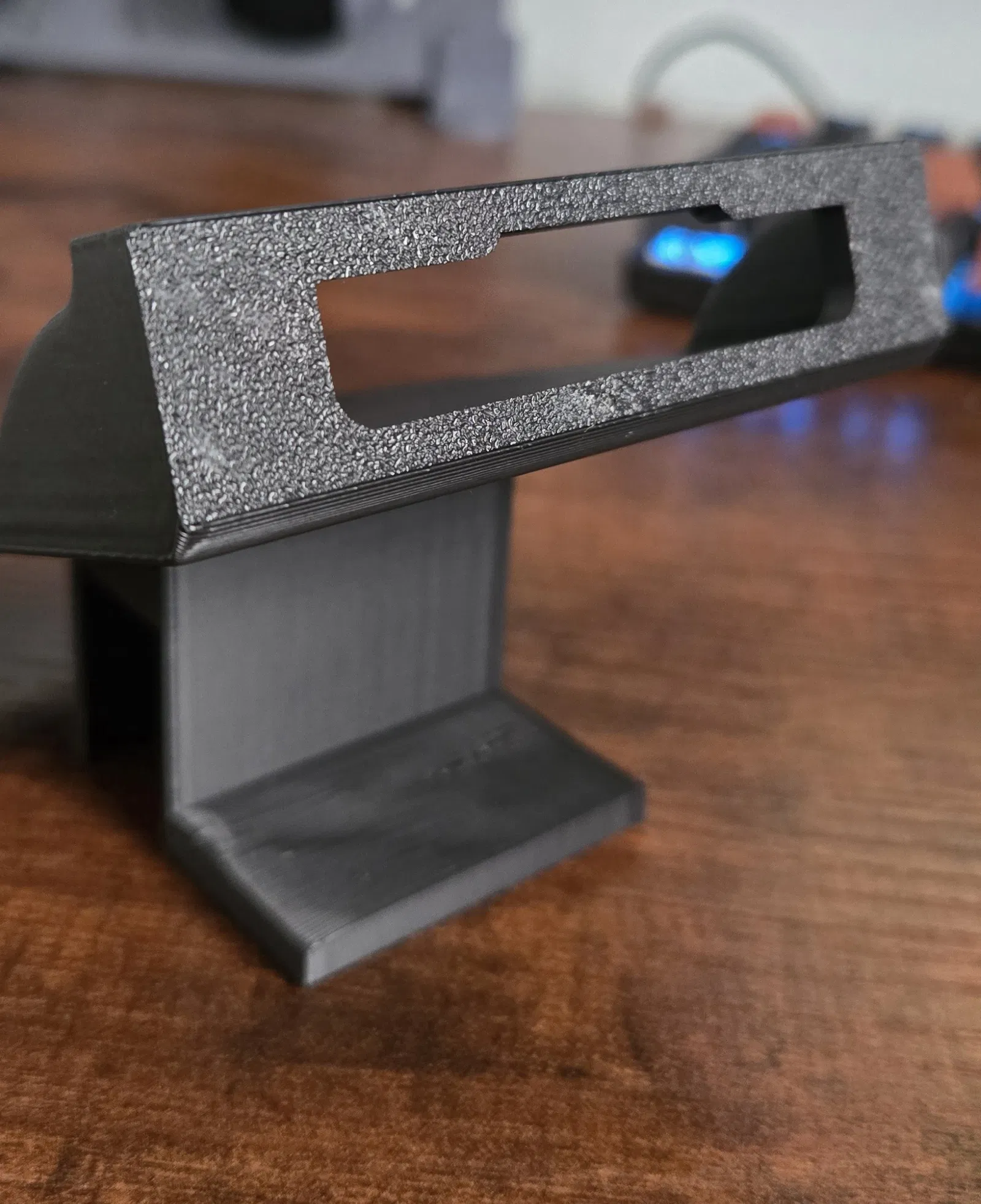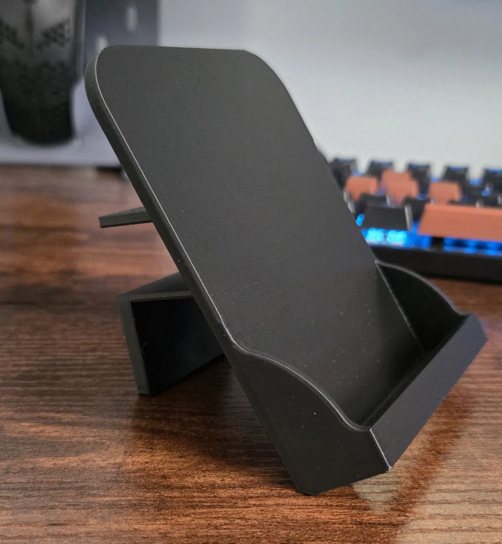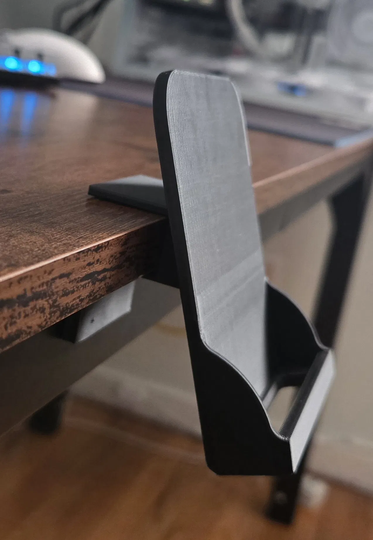 Mẫu giá đỡ điện thoại gắn vào mép bàn bằng nam châm. Vừa với mép bàn dày khoảng 17mm và phần kẹp dài 28mm, phù hợp điện thoại rộng 80mm trở xuống. Lắp ráp bằng cách dán các mảnh và gắn 3 nam châm 10x3mm.