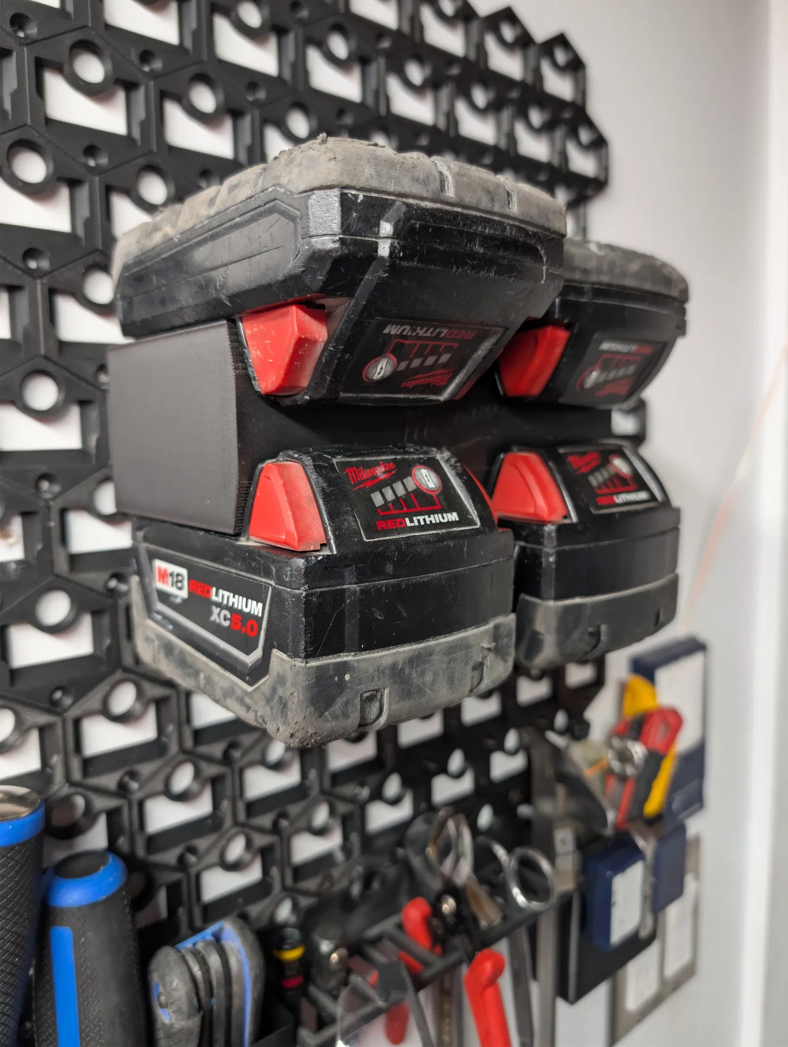 Khay giữ pin Milwaukee M18 chứa được 4 viên, đã bỏ lỗ bắt vít gắn tường và thêm móc treo GOEWS để treo lên hệ tường GOEWS/wall organizer. Tiện gọn cho việc sắp xếp pin.