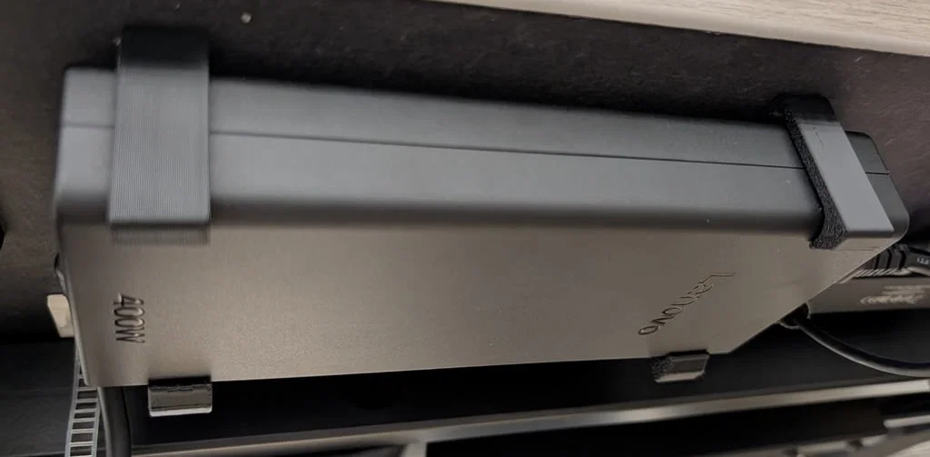 Mẫu ngàm gắn dưới bàn để cố định cục nguồn (power brick) 400W của Lenovo đi kèm laptop Legion Pro 7 Gen 10. Thiết kế giúp gọn dây, tiết kiệm diện tích; khuyến nghị in bằng PETG.
