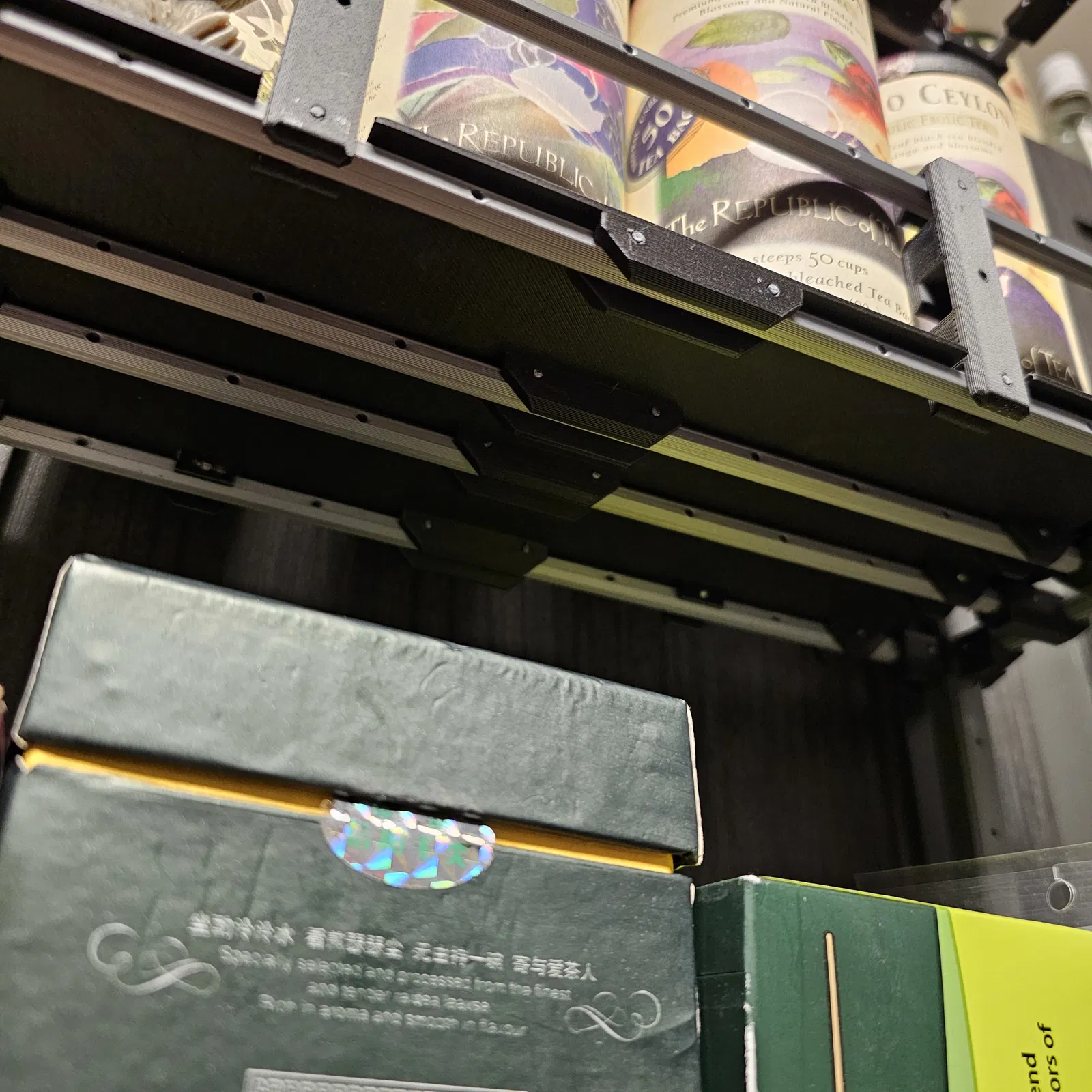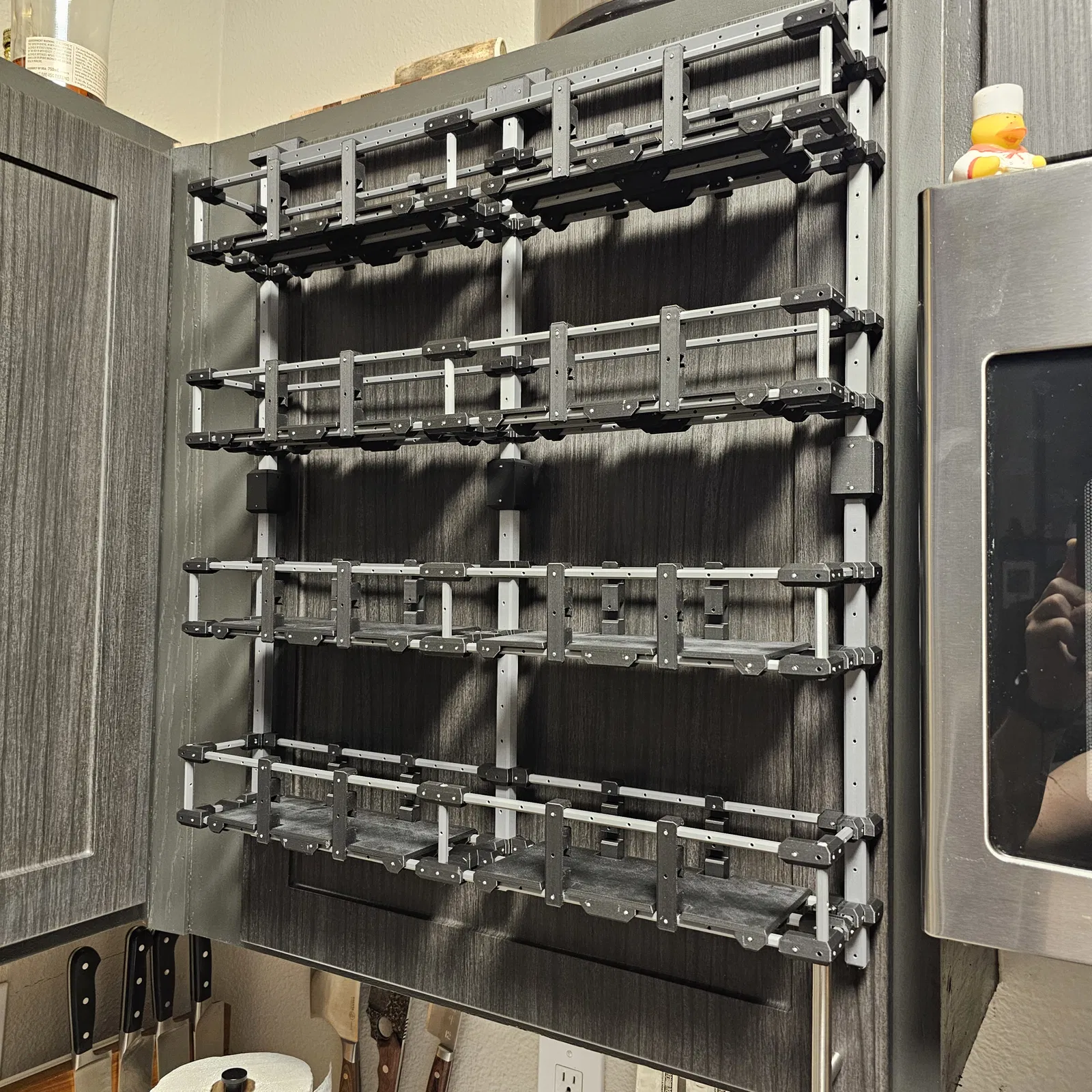 Hệ kệ lưu trữ modular treo trên cánh tủ 3/4", tùy biến kích thước rộng/dài/sâu theo nhu cầu. In được toàn bộ, lắp bằng filament làm rivet; phù hợp cả máy nhỏ như A1 Mini cho bếp và căn hộ nhỏ.