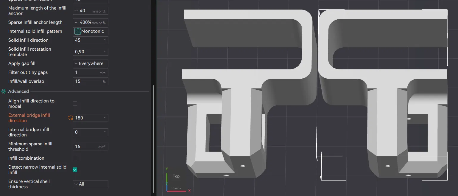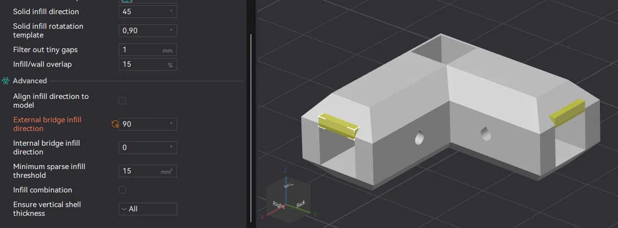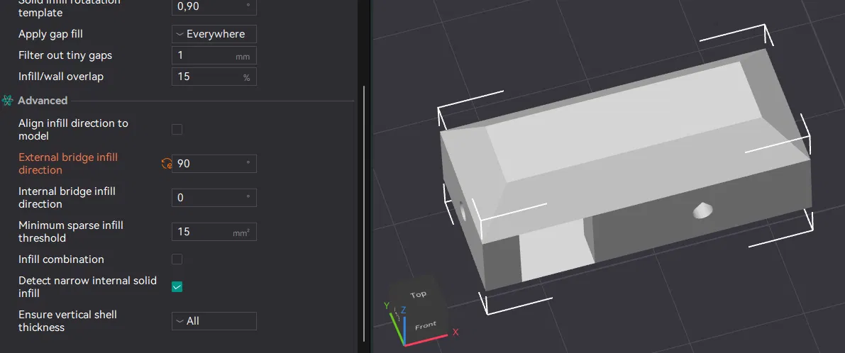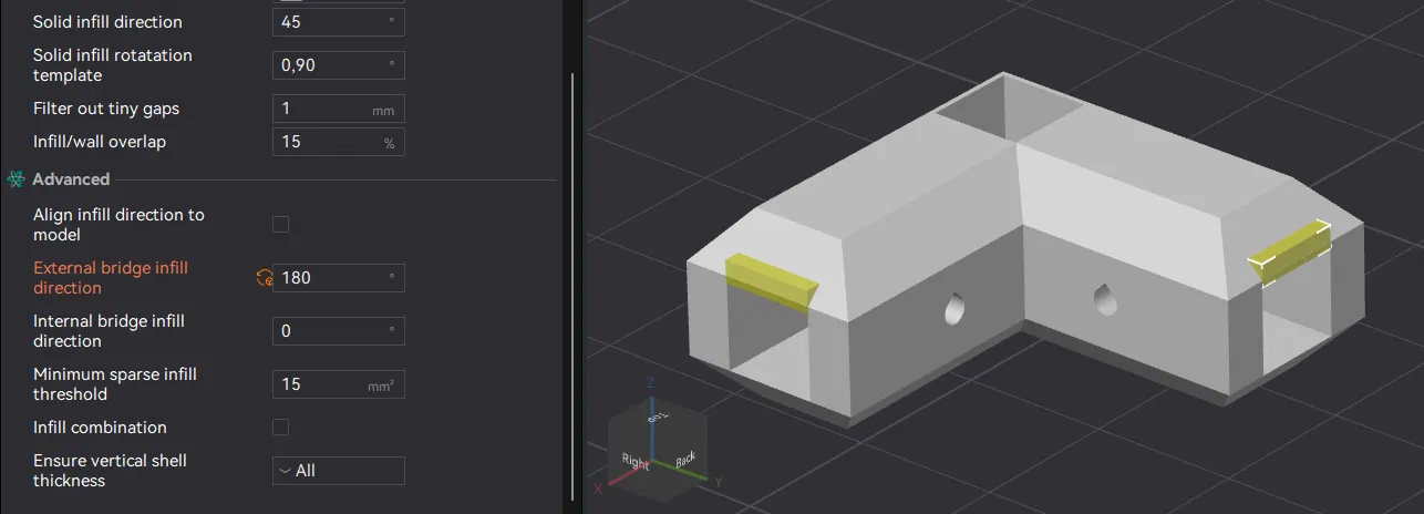 • External Bridge Direction: Thiết lập theo từng part, đảm bảo bridge ngắn nhất (đã pre-configured trong file .3mf)