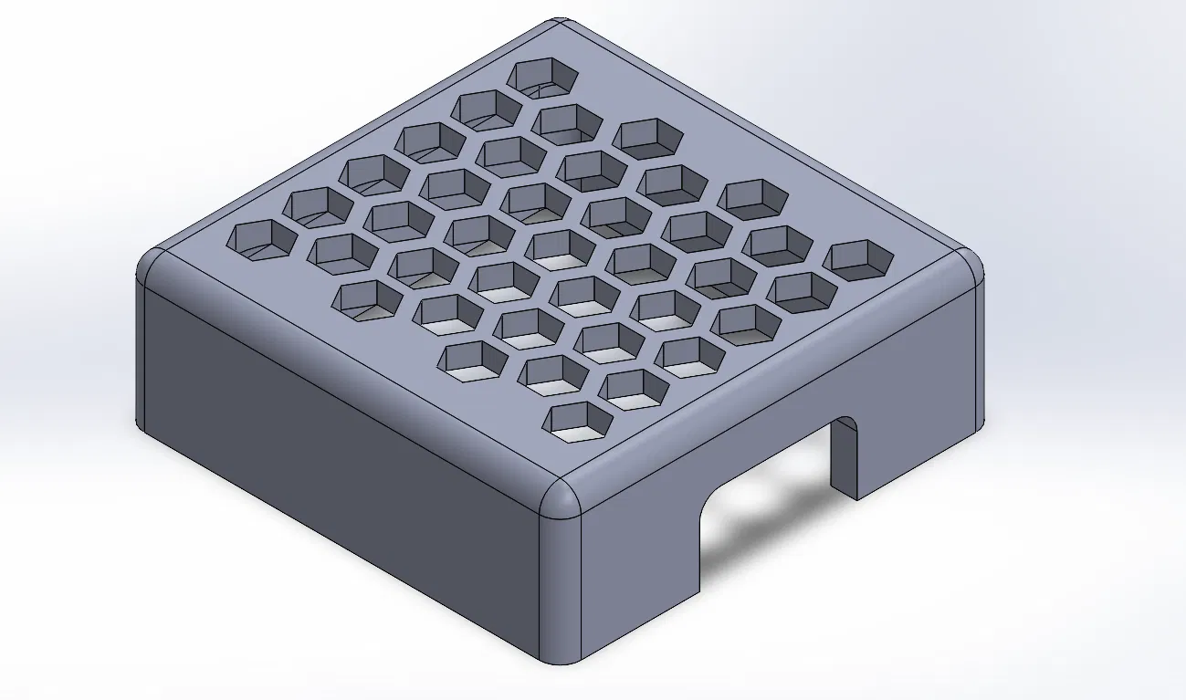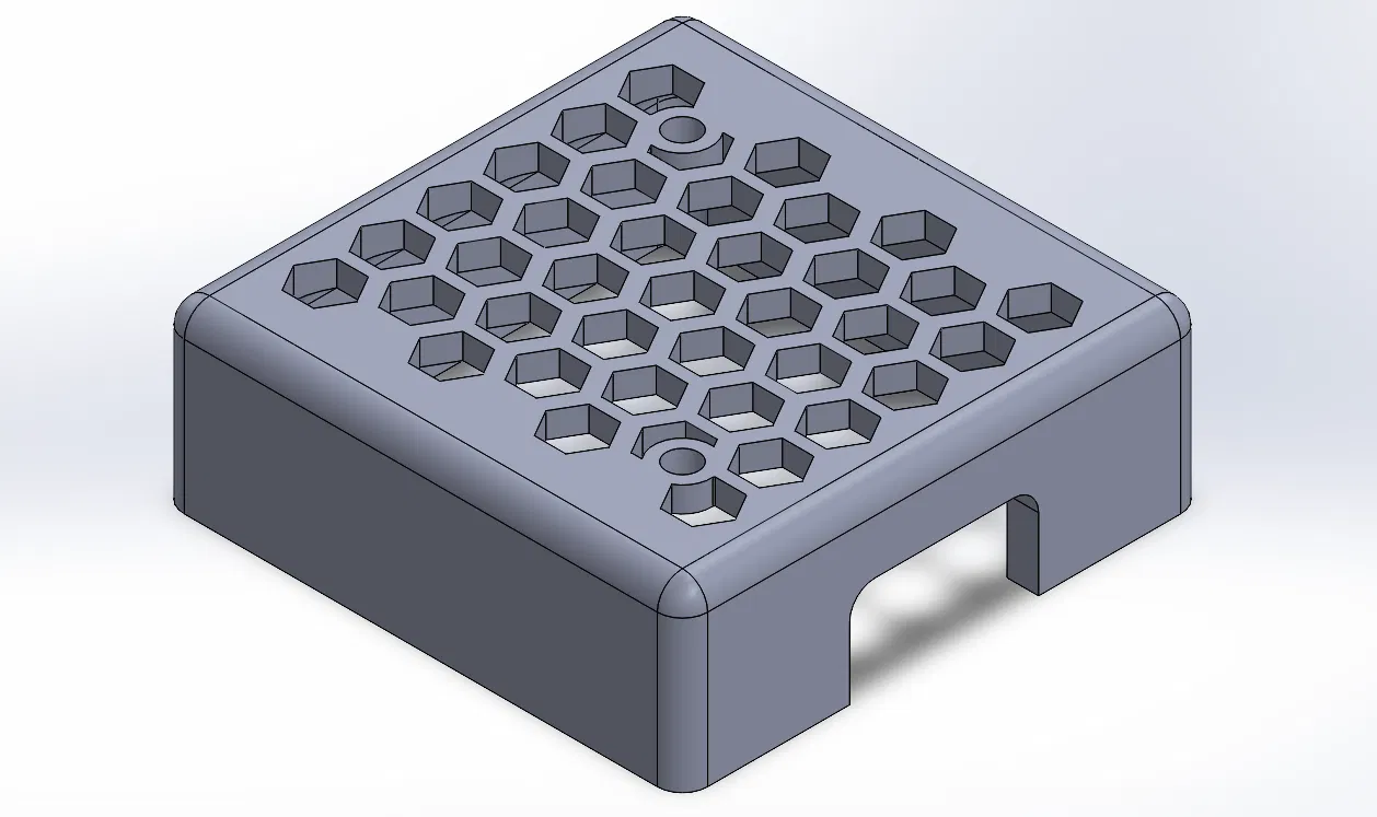 Case cơ bản, mặt trên có họa tiết lục giác để giảm vật liệu và thời gian in, kèm một khoảng hở bên hông để dây đi qua.