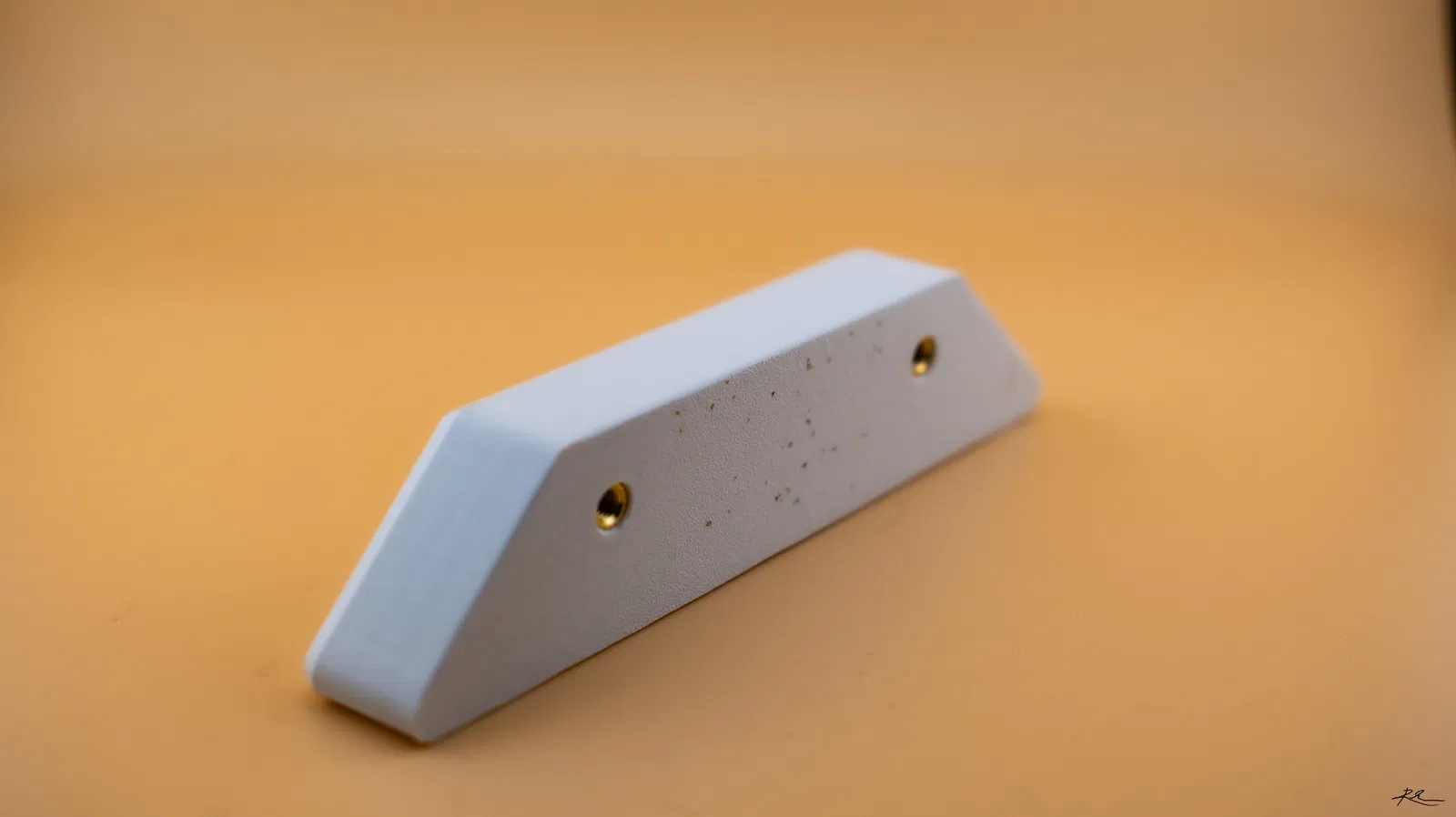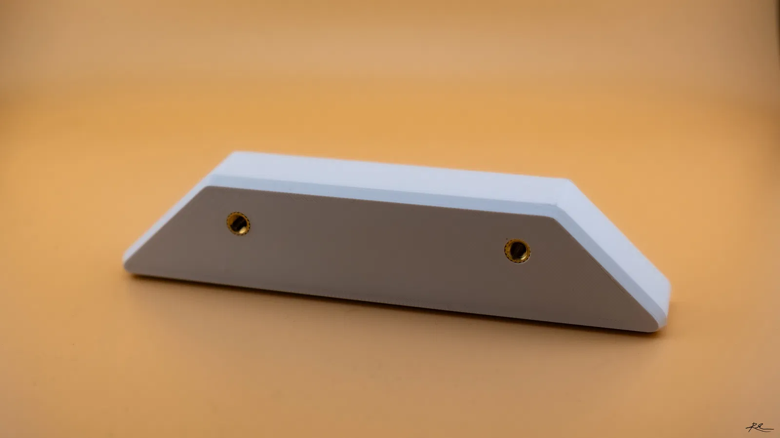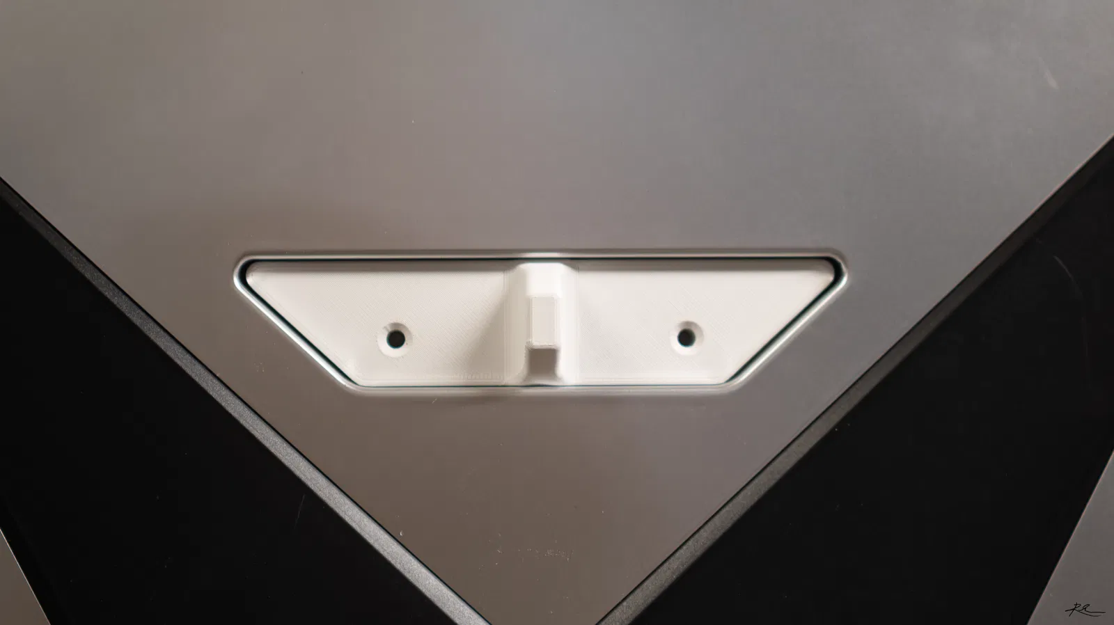 2. Tray Mounting Insert - Model này phẳng một mặt và mặt còn lại được vát nhẹ (chamfer). Nó có 2 lỗ và bạn sẽ cần lắp heat insert ren M5 vào đó. Bạn sẽ cần tổng cộng 4 insert ren M5 vì mỗi lỗ sẽ lắp 2 cái từ hai phía (một bộ để bắt ốc từ phía trong máy nhằm cố định khối này vào handle inset, bộ còn lại để bắt ốc gắn khay tool tray). KHÔNG ĐƯỢC ĐÚT KHỐI NÀY VÀO HANDLE INSET KHI CHƯA LẮP INSERT REN SẴN!! (Sẽ rất khó lấy ra, và nhiều khả năng bạn phải dùng keo CA dán một thứ gì đó vào mặt ngoài rồi kéo ra. Nếu đã có heat insert trong khối, bạn chỉ cần vặn vài con ốc vào để kéo nó ra.)
