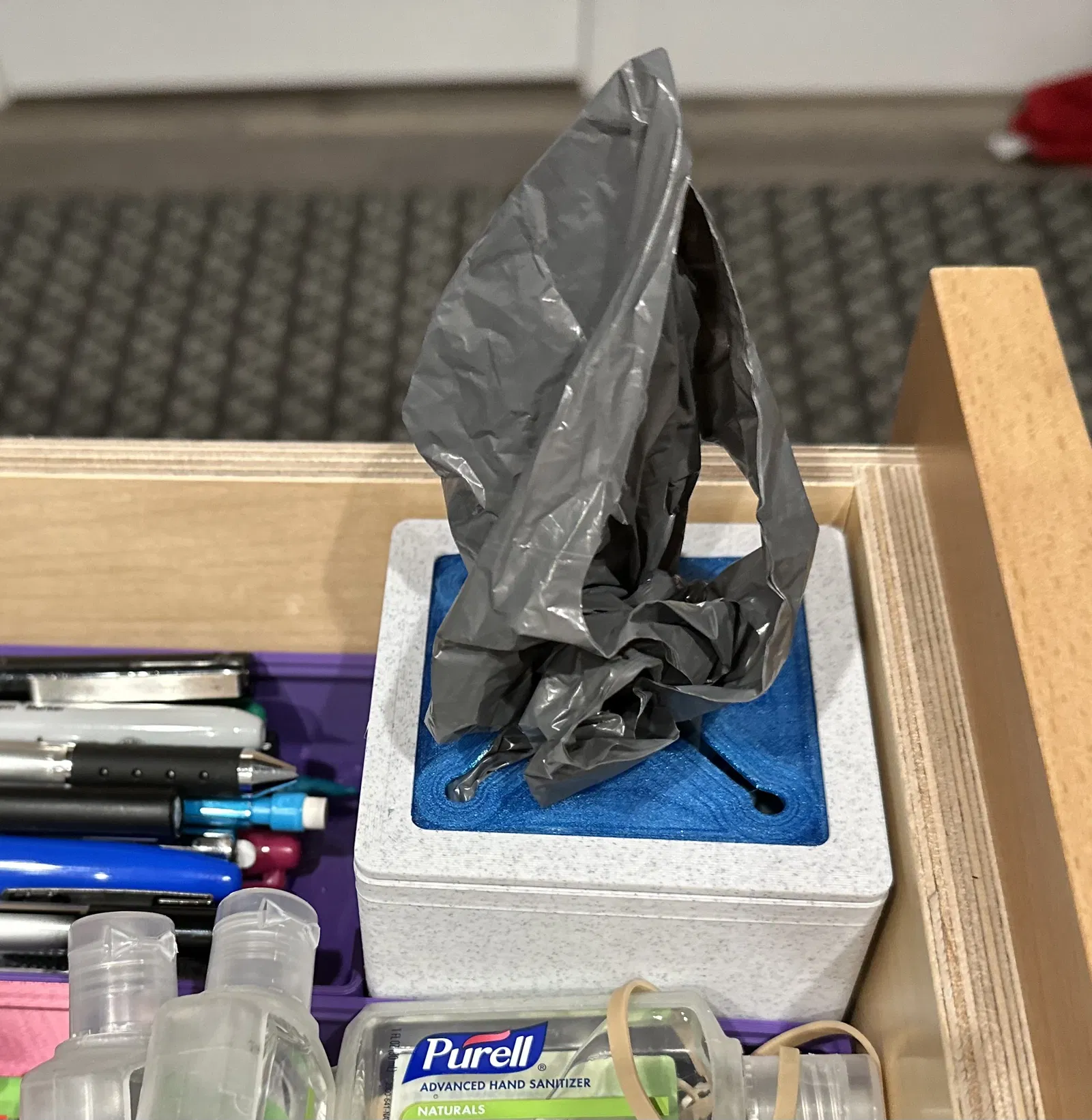 Mình cần một cái bin để đựng túi nhặt phân chó trong ngăn kéo lặt vặt, nên làm ra mẫu nắp Gridfinity này. In phần ngoài bằng filament cứng, phần trong bằng TPU/filament mềm rồi dán lại và bấm lên bin.