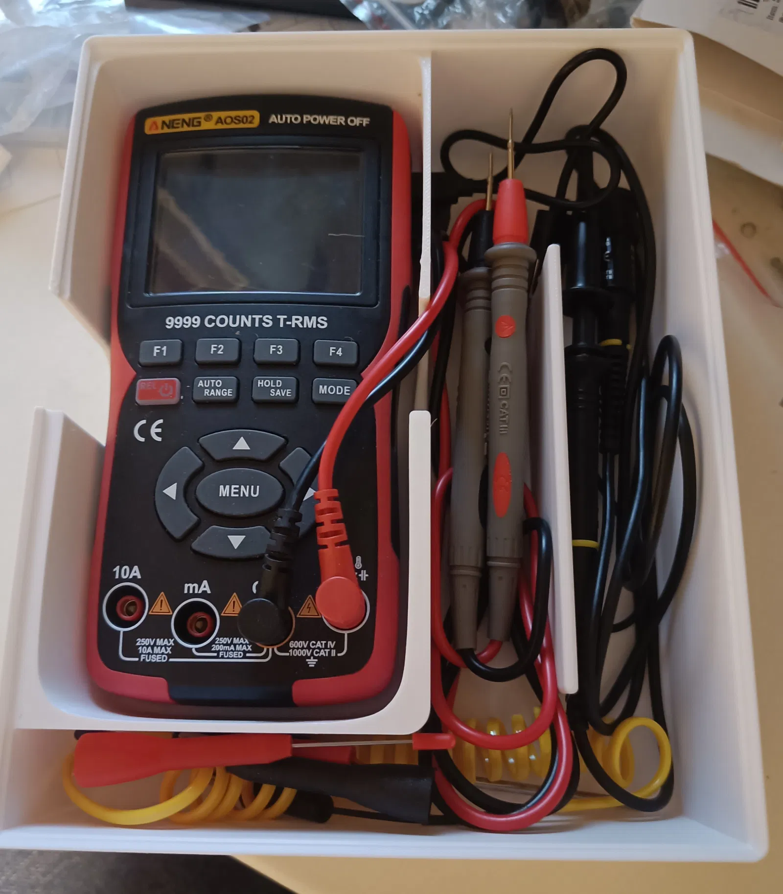 Hộp Gridfinity để cất multimeter Aneng AOS02, có ngăn để que đo và các lỗ chừa sẵn giúp bạn dùng máy trực tiếp khi vẫn đặt trong hộp, không cần lấy ra ngoài.