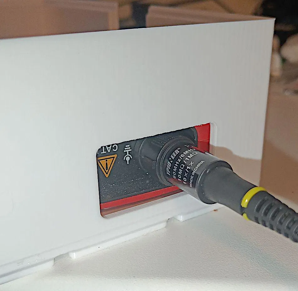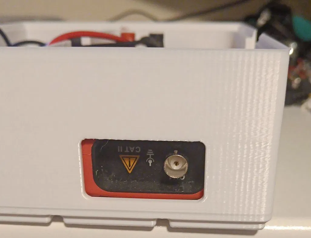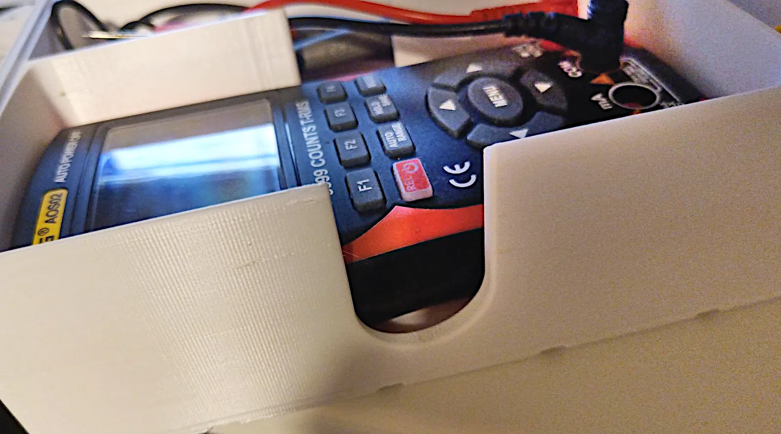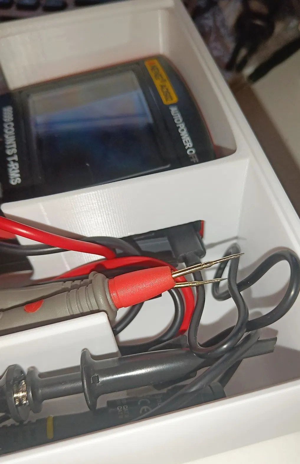 Chỉ là một hộp Gridfinity cho cái đồng hồ đo (multimeter) của mình, có chỗ để cất que đo (probes), và có các lỗ để có thể sử dụng nó mà không cần lấy ra khỏi hộp.