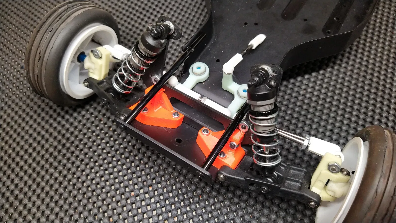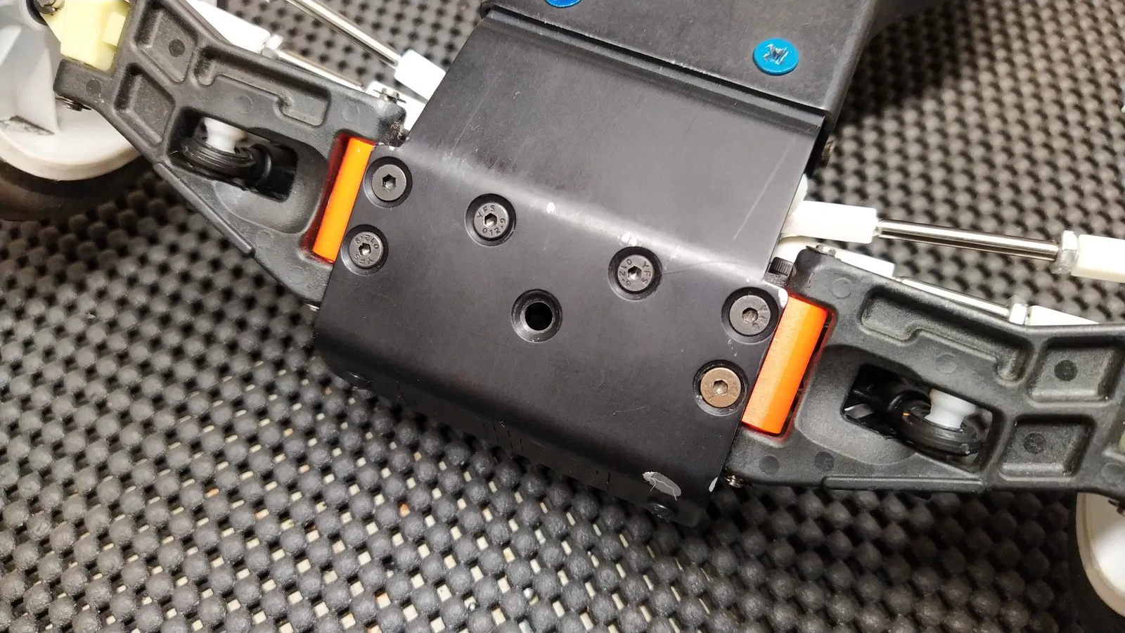 Ngàm gắn tay trước (front arm mount) cho RC10, bắt bằng vít M3. Vít tháp phuộc (shock tower) dùng M3x14. Vít bắt vào chassis dùng M3x12. Dùng chốt bản lề (hinge pins) zin của RC10.