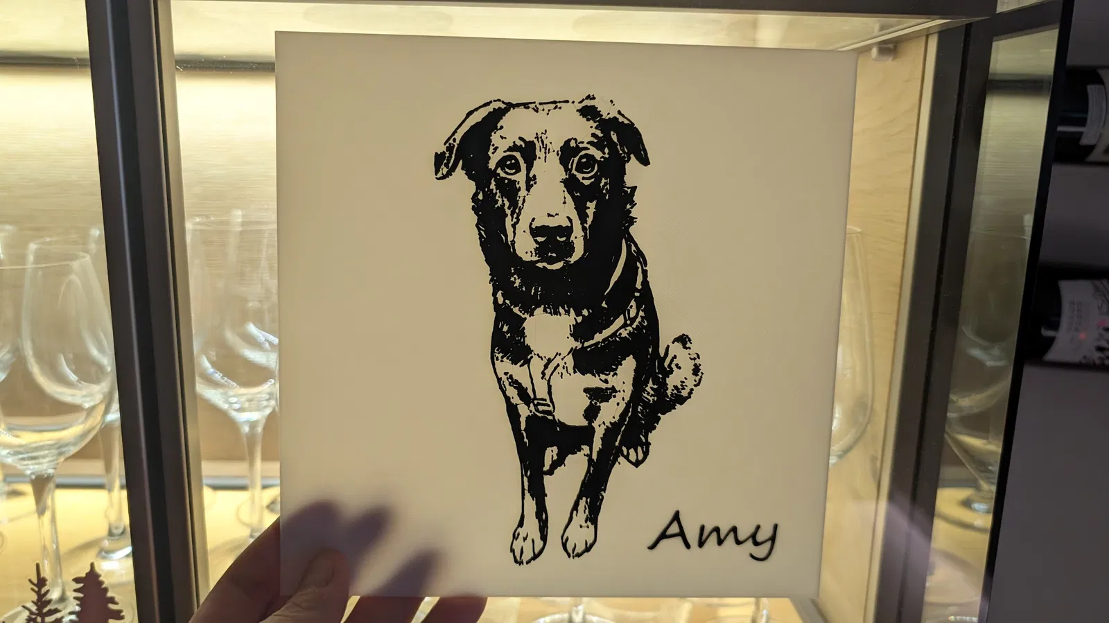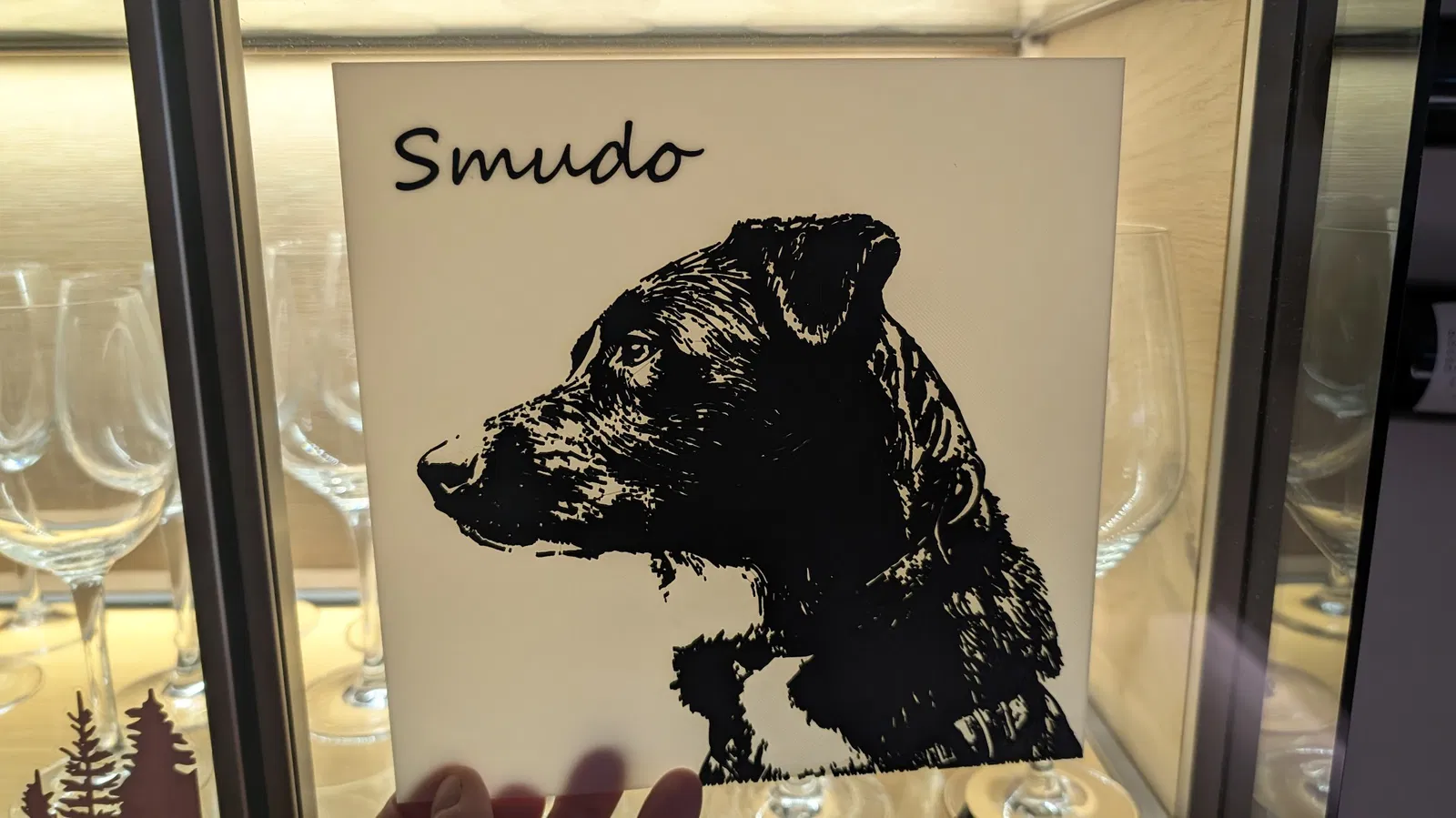 Mình tạo một file .svg kiểu “vẽ tay” từ hình chó của mình rồi in với hiệu ứng 3D trên tấm plate trắng dày 1mm, có nhúng sẵn tên.