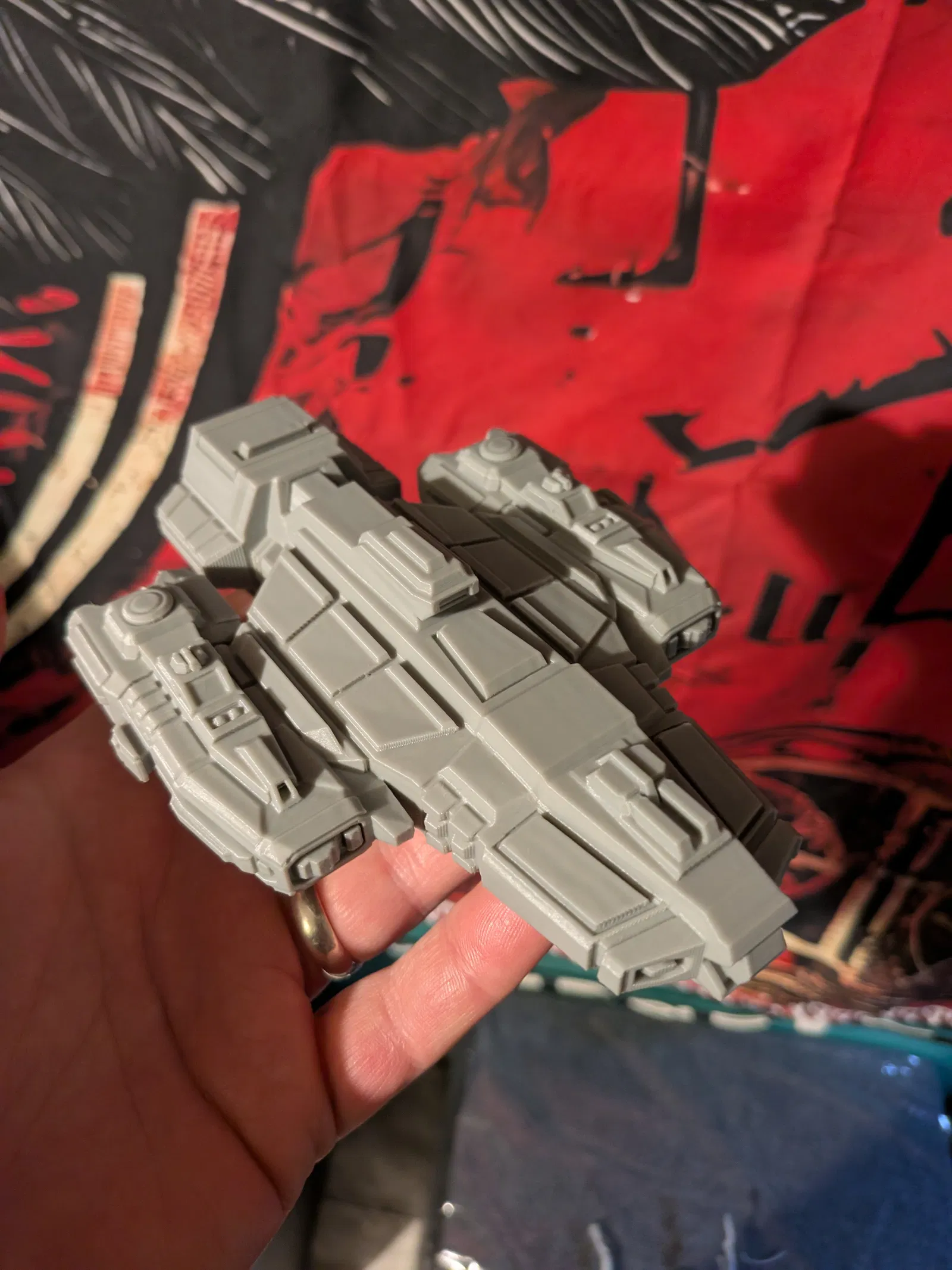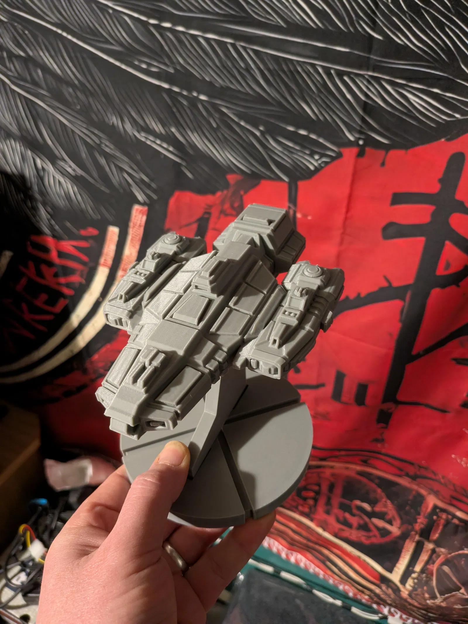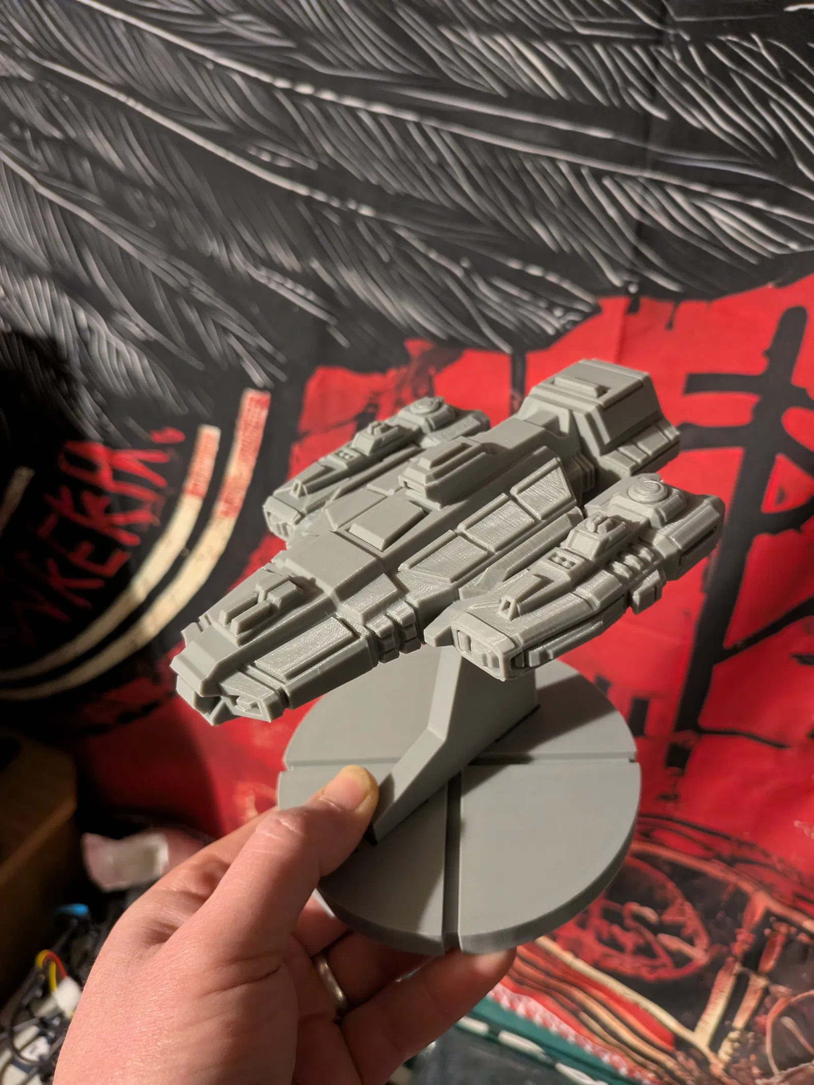 Tàu chiến, bản remix từ tác giả gốc vì mình thấy nhìn ngầu khi nghịch thử bản model phóng to 400% rồi gắn 2 con tàu fleet 2 ở hai bên, nhìn như động cơ vậy. Thấy ổn quá nên mình quyết định in lại và tiện thể reupload luôn.