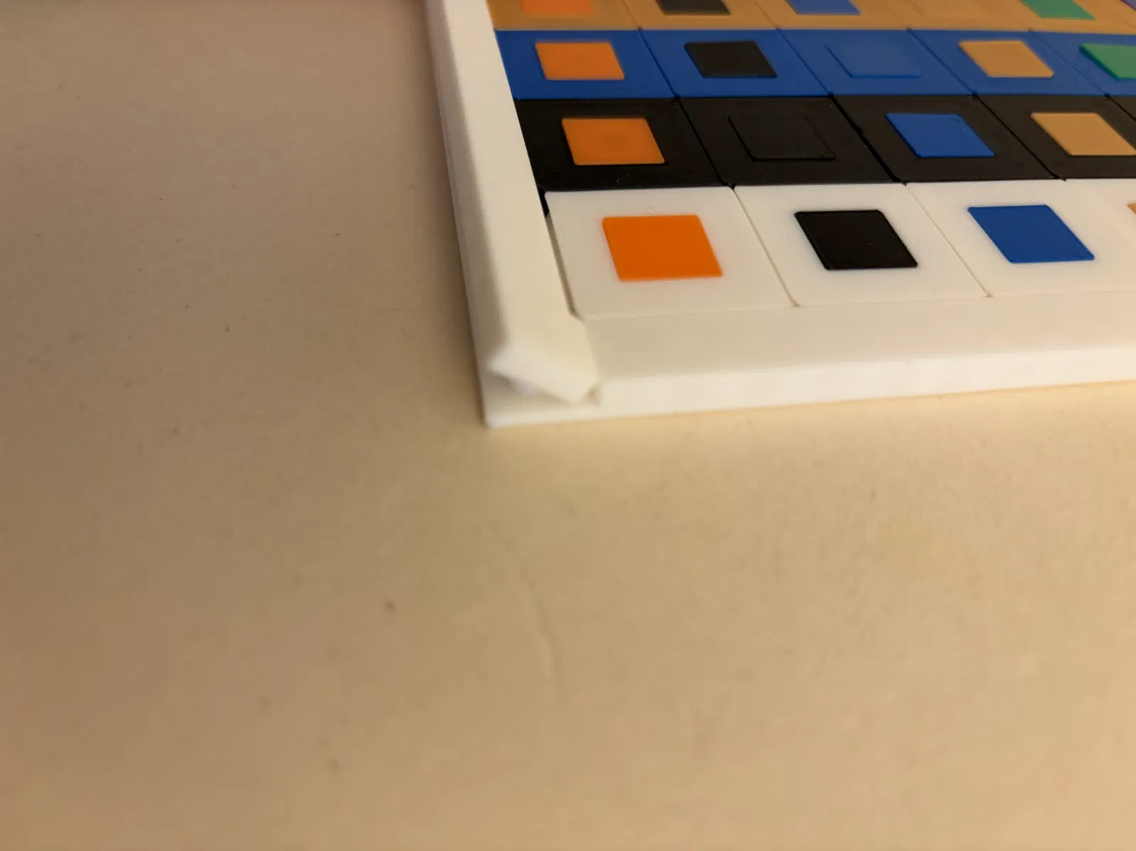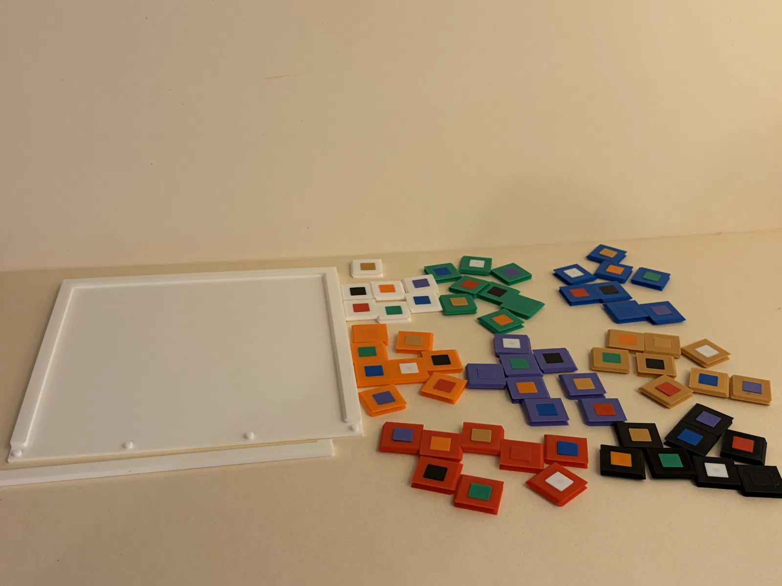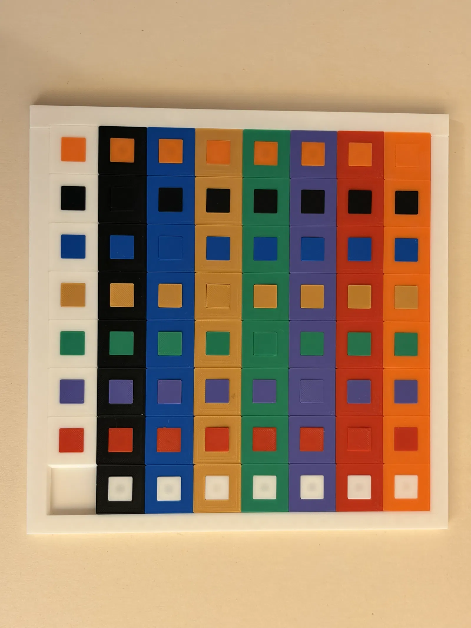 Sau khi in xong tất cả các phần, các tile nhỏ cần được ấn vào các mảnh. Dĩ nhiên phải tạo đủ mọi tổ hợp màu (xem hình 3). Mảnh có màu “inner” và “outer” trùng với màu của khung thì không cần dùng — chỗ đó sẽ tạo ra ô trống để trượt trong sliding puzzle (bản in của mình thì đây là mảnh White/White).
