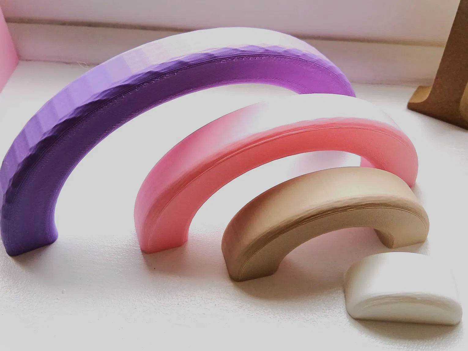 Để tham khảo, bản in trong hình (từ nhỏ đến lớn) mình dùng: BAMBU LAB Matte Ivory White PLA, ELEGOO Matte Beige PLA, DEEPLEE Matte Sakura Pink PLA và BAMBU LAB Matte Lilac Purple PLA.