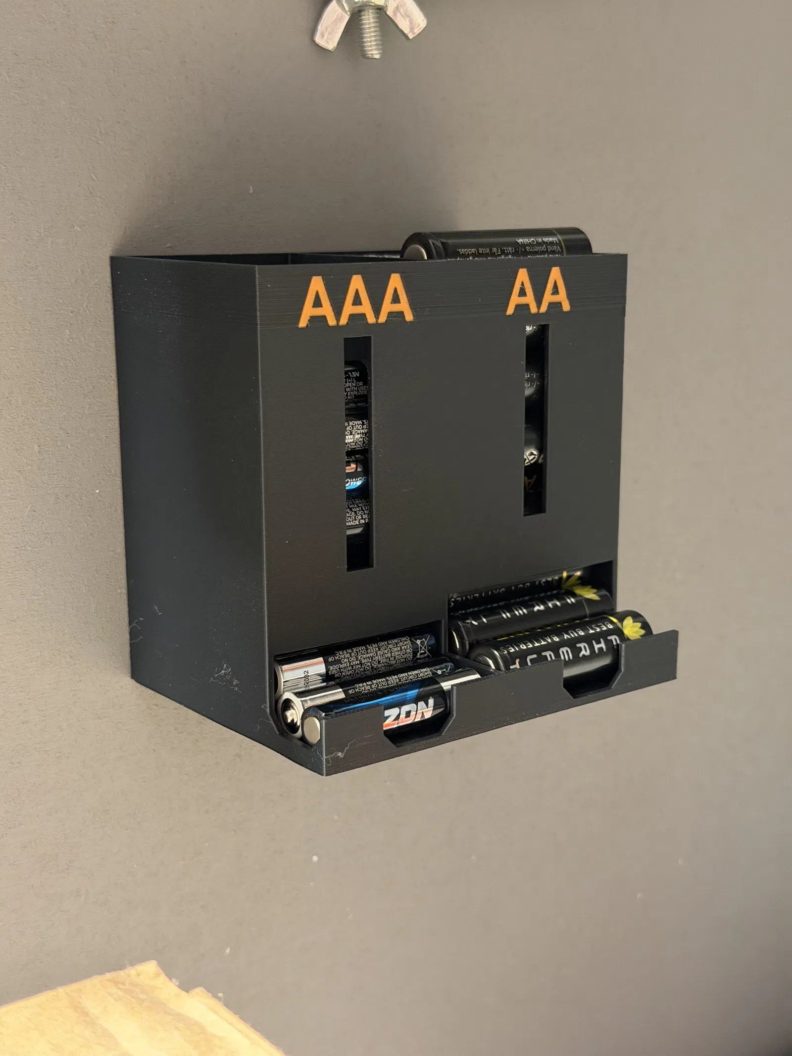 Khay đựng pin MMU của Nodashi có chữ cái nhiều màu, kèm các lỗ sẵn để bắt vít treo tường. Phù hợp lưu trữ pin AA/AAA gọn gàng, dễ phân loại và lấy nhanh khi cần.