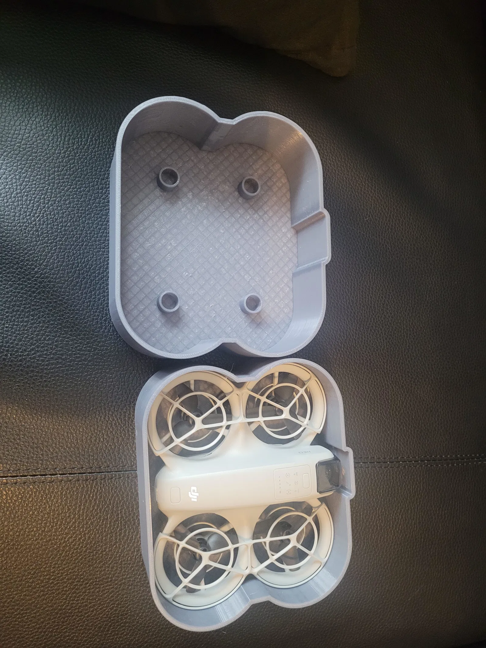 Case cho DJI Neo 1 dạng 2 mảnh, thiết kế chừa khe hở (clearance) 0.4mm để lắp ráp dễ. Tác giả in thử ở layer height 0.12mm, phù hợp khi cần bề mặt mịn.