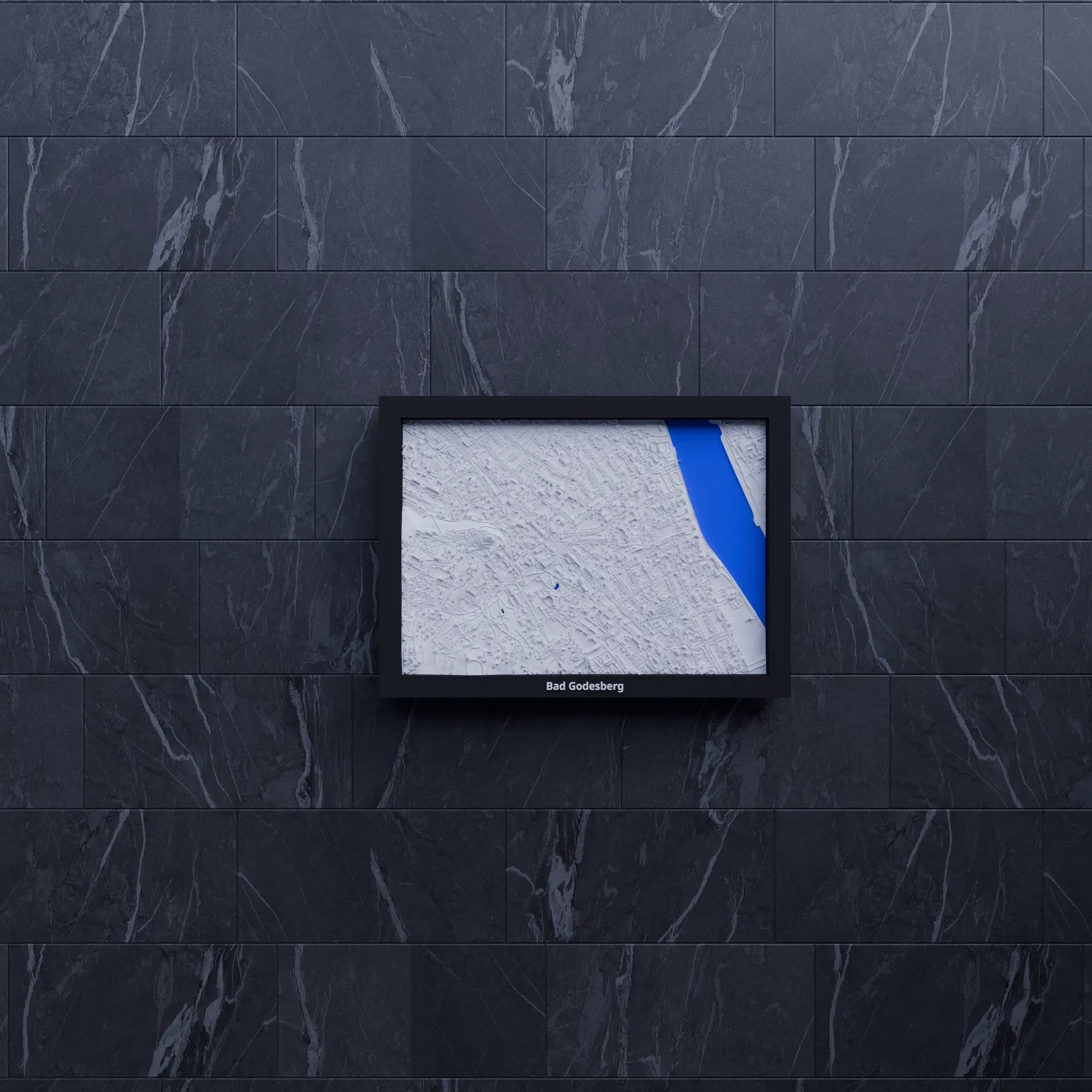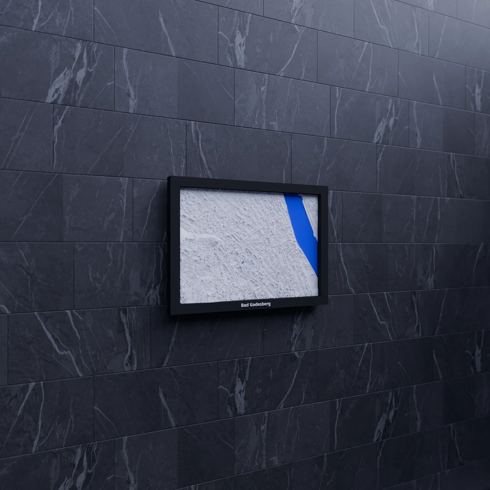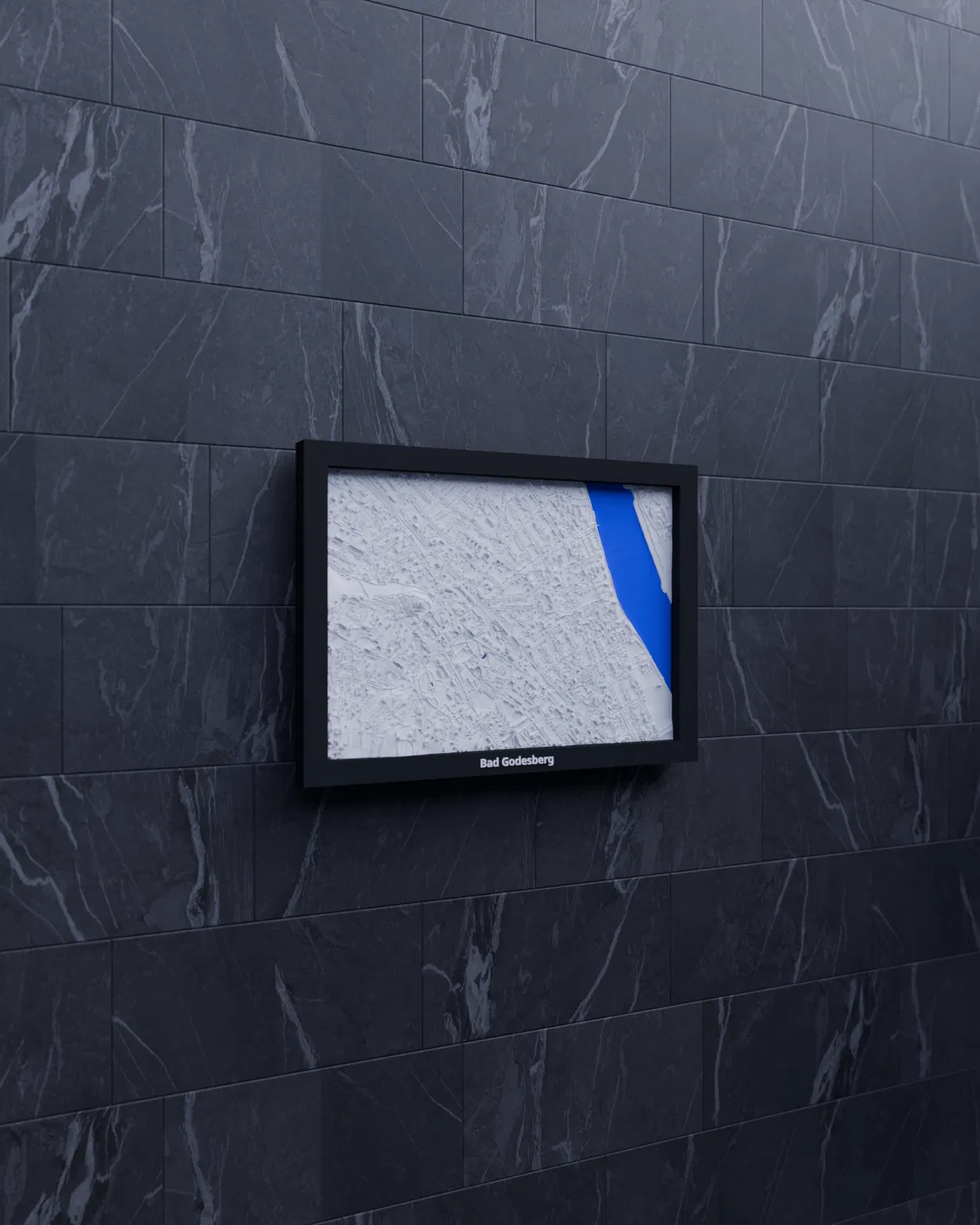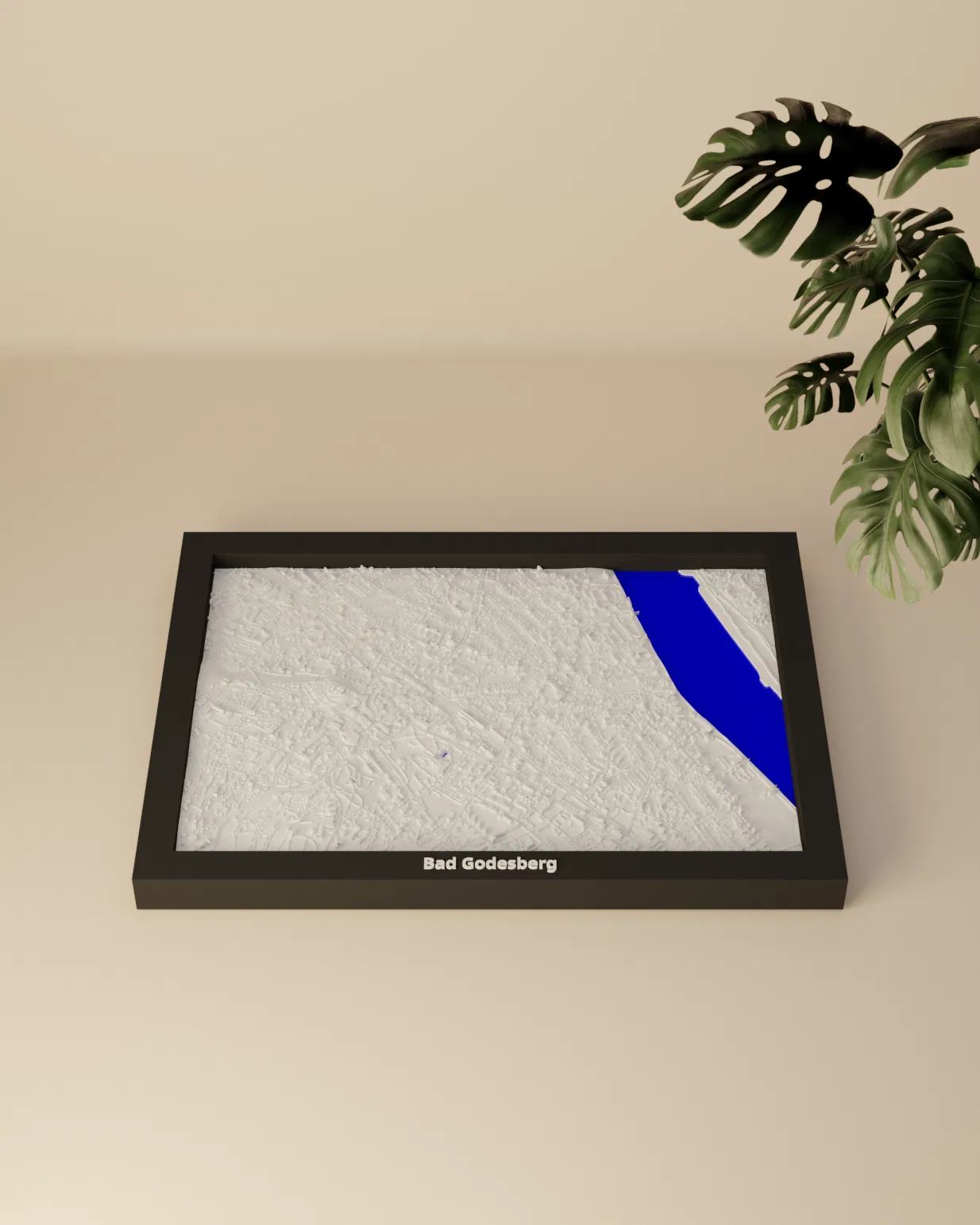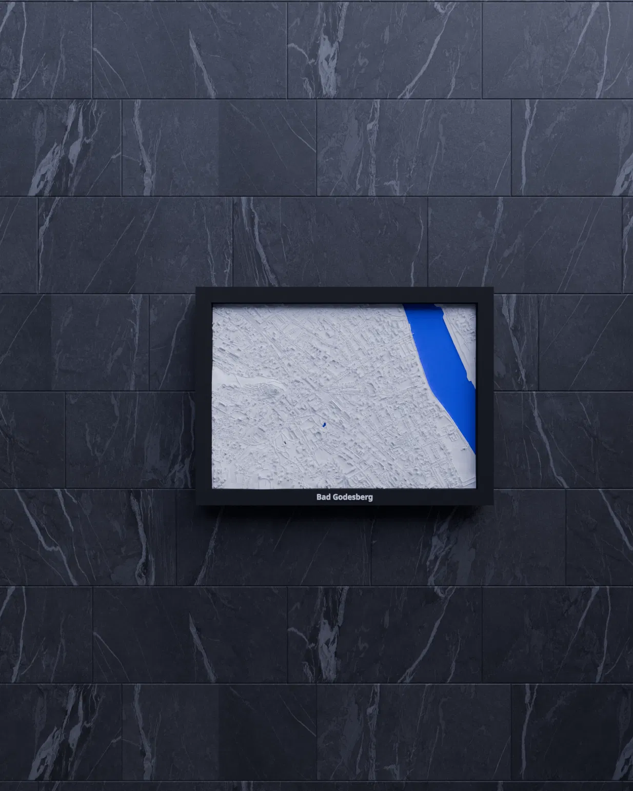 Mô hình địa hình thu nhỏ 3D tái hiện Bad Godesberg (Đức) từ dữ liệu địa lý, tỷ lệ ~16536:1. Kèm nhiều lựa chọn frame có lỗ treo, phù hợp in multicolor hoặc single color để trưng bày, học tập hay trang trí.