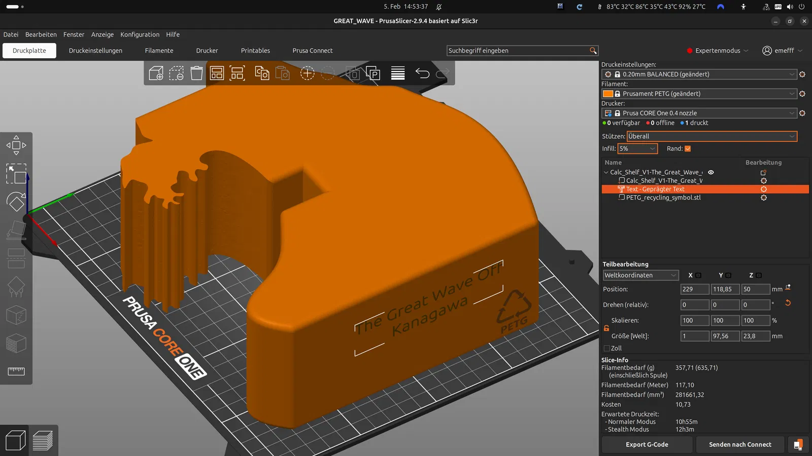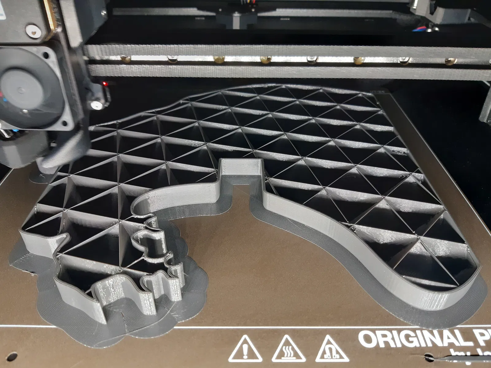 Khoảng hở ở “tầng” đầu tiên của kệ cũng là 85mm. Tầng thứ hai phía trên có thể để những món lớn hơn. Mình in mẫu này bằng Prusament PETG tái chế, dùng cubic infill 5% (sóng lớn) và 10% (sóng nhỏ). Một vài chỗ ở lớp vỏ ngoài (outer shell) in ra không được đẹp lắm, nhưng đành chịu vậy.