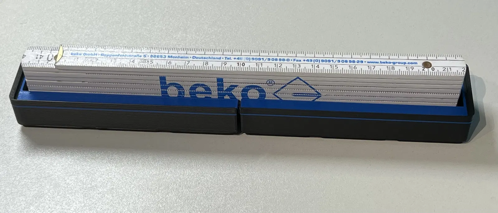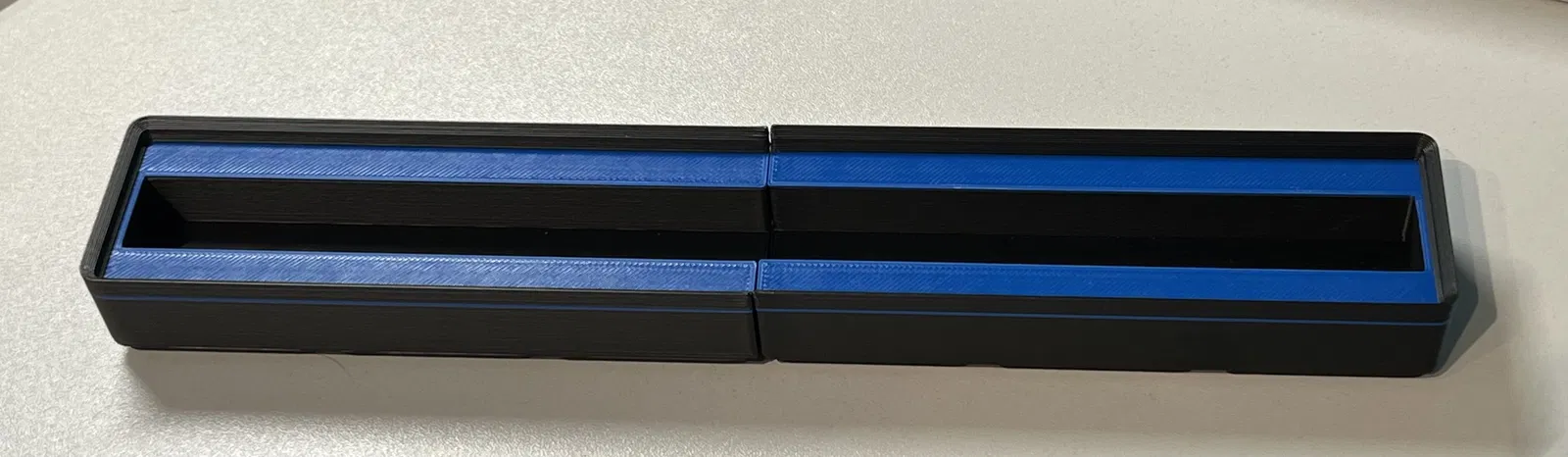 Hộp Gridfinity 6x1x3u cho thước gấp (Zollstock). Có thể in 2 màu tuỳ chọn như hình minh hoạ (xem file .3mf). Khi in trên ví dụ như MK4S, cần chia hộp thành 2 phần như thể hiện trong file .3mf.