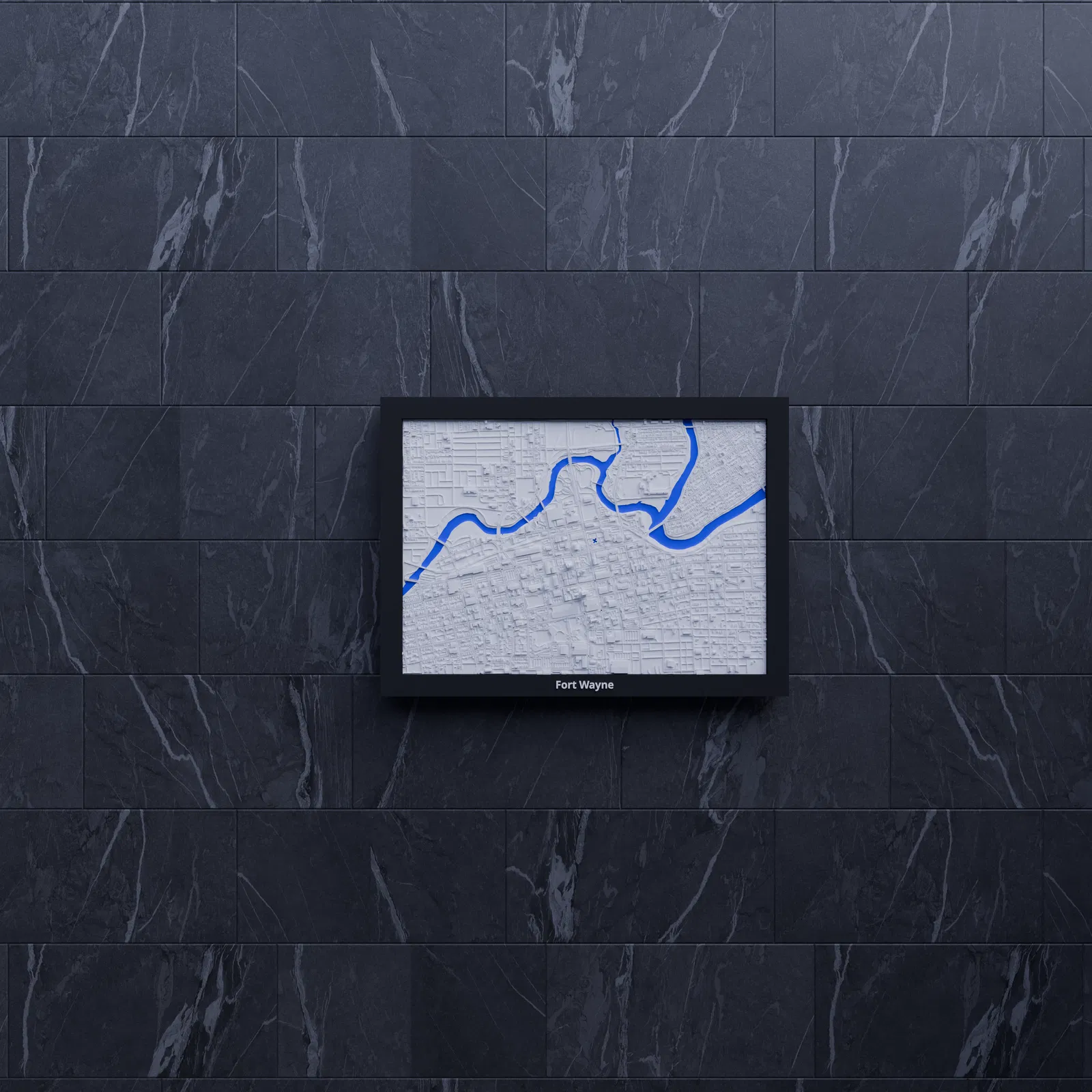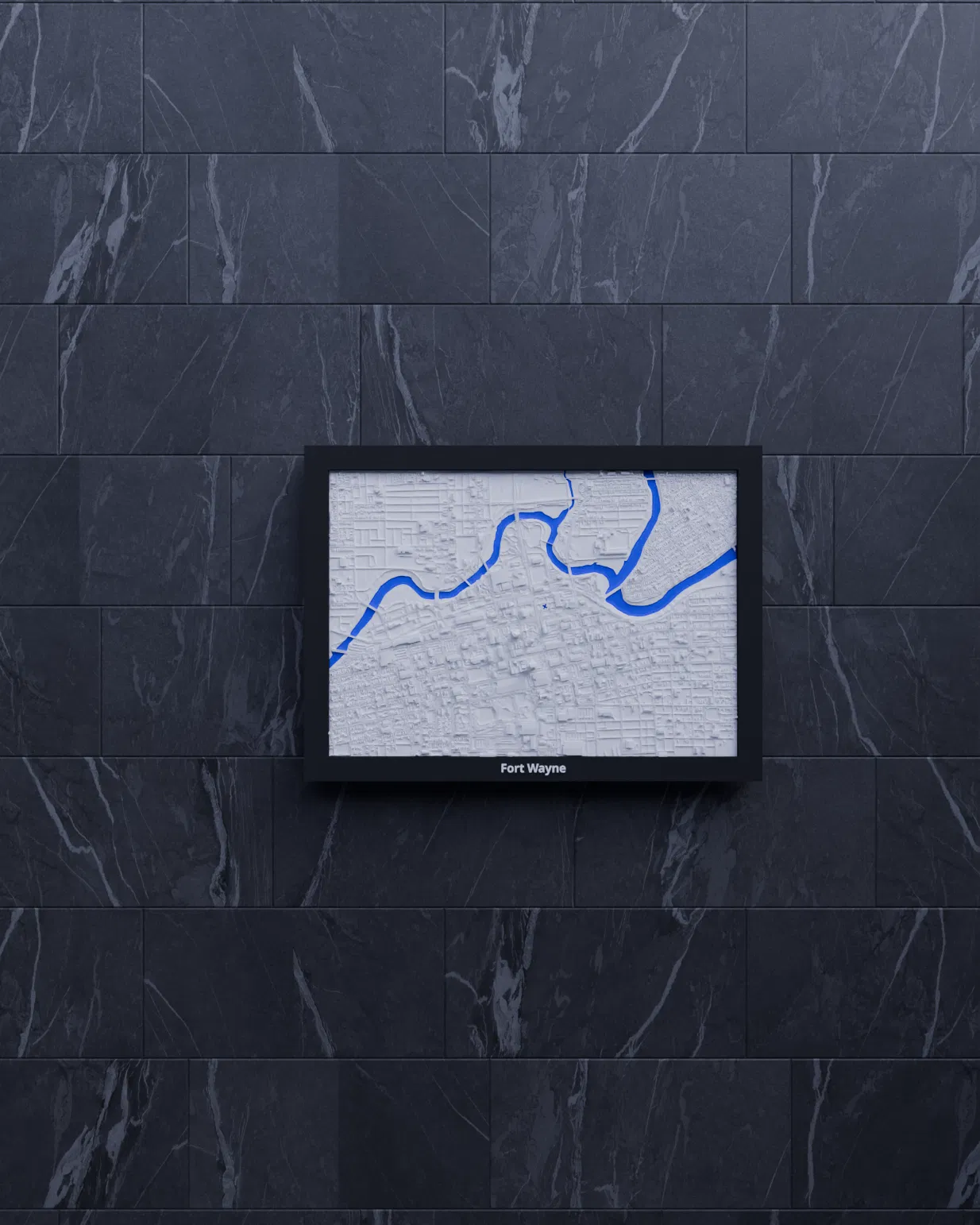 Tái hiện địa hình Fort Wayne bằng mô hình topographic thu nhỏ, dựng từ dữ liệu địa lý thật. Kích thước in 170.5 x 119.5 mm, tỷ lệ xấp xỉ ~16225:1, kèm nhiều frame có/không khắc chữ và lỗ treo.
