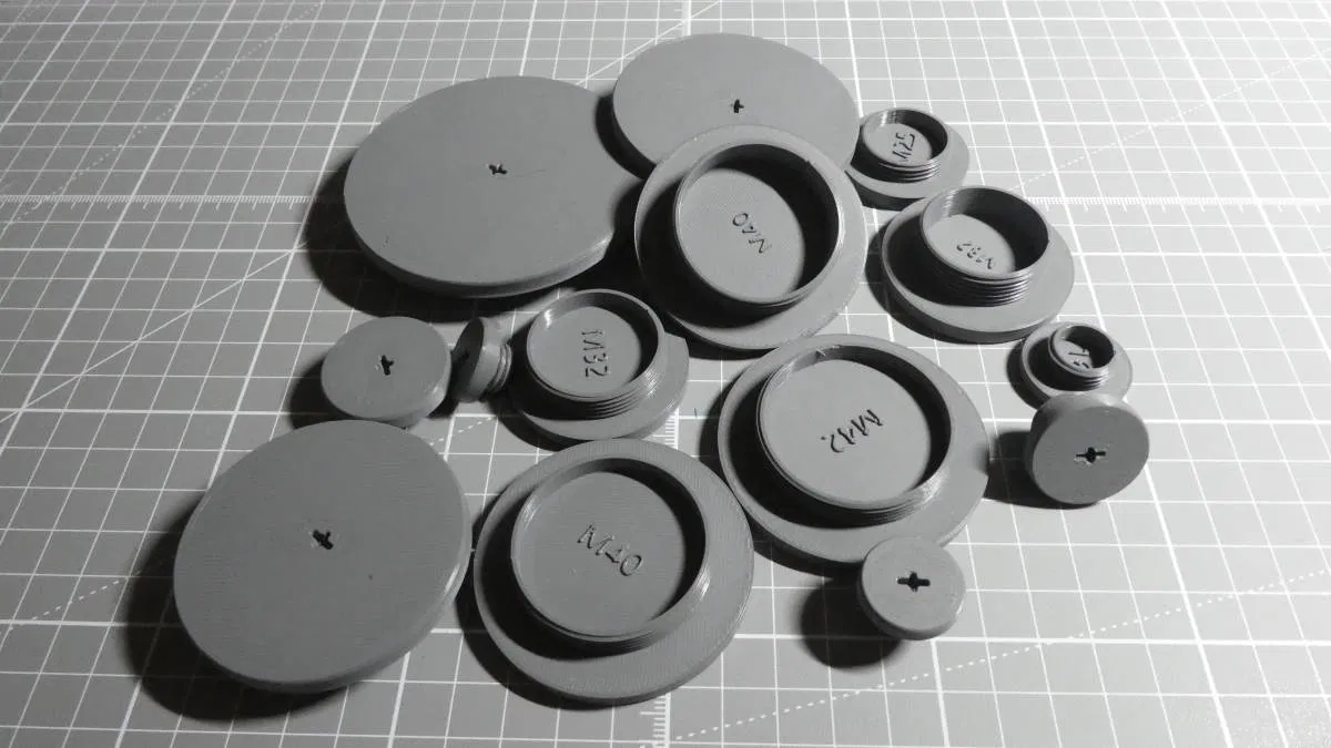 Bộ sưu tập chi tiết hệ mét gồm blanking plugs, bushing, locknuts và washers để bịt lỗ, dẫn cáp và cố định trên metal trunking/panel/rack. Ren pitch 1.5mm; gợi ý in 0.2mm layer, washer in TPU.