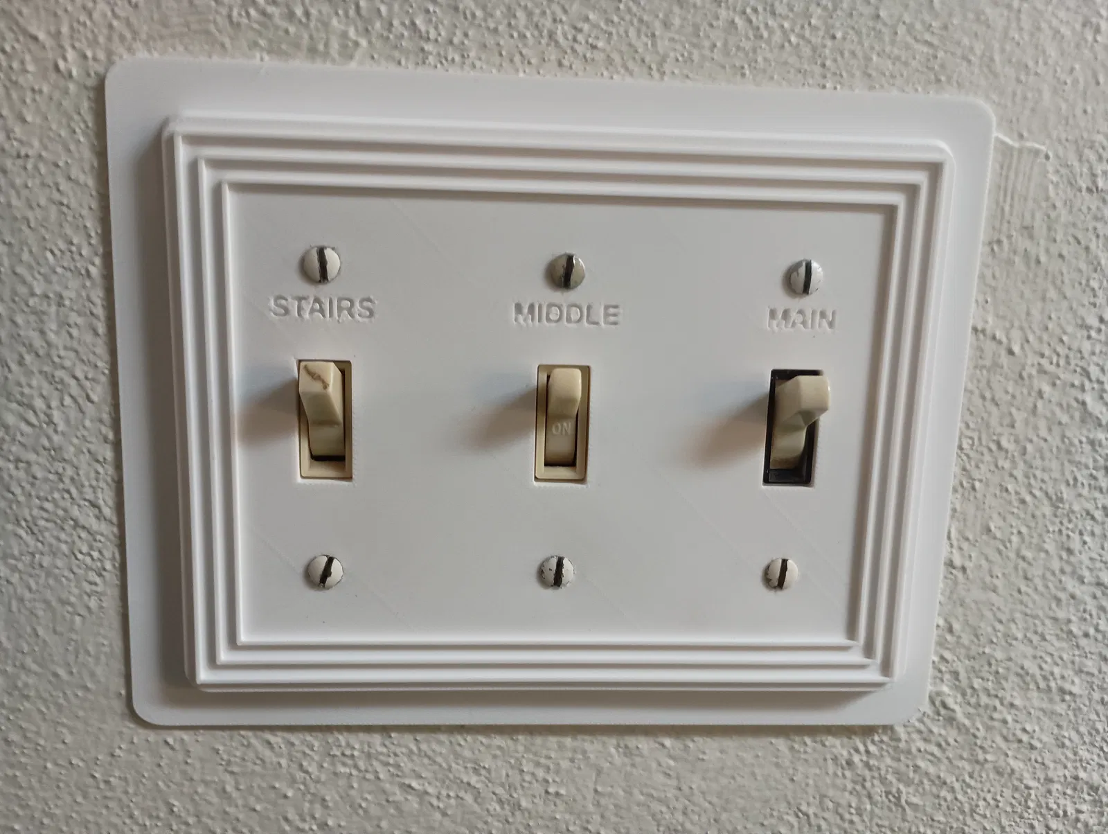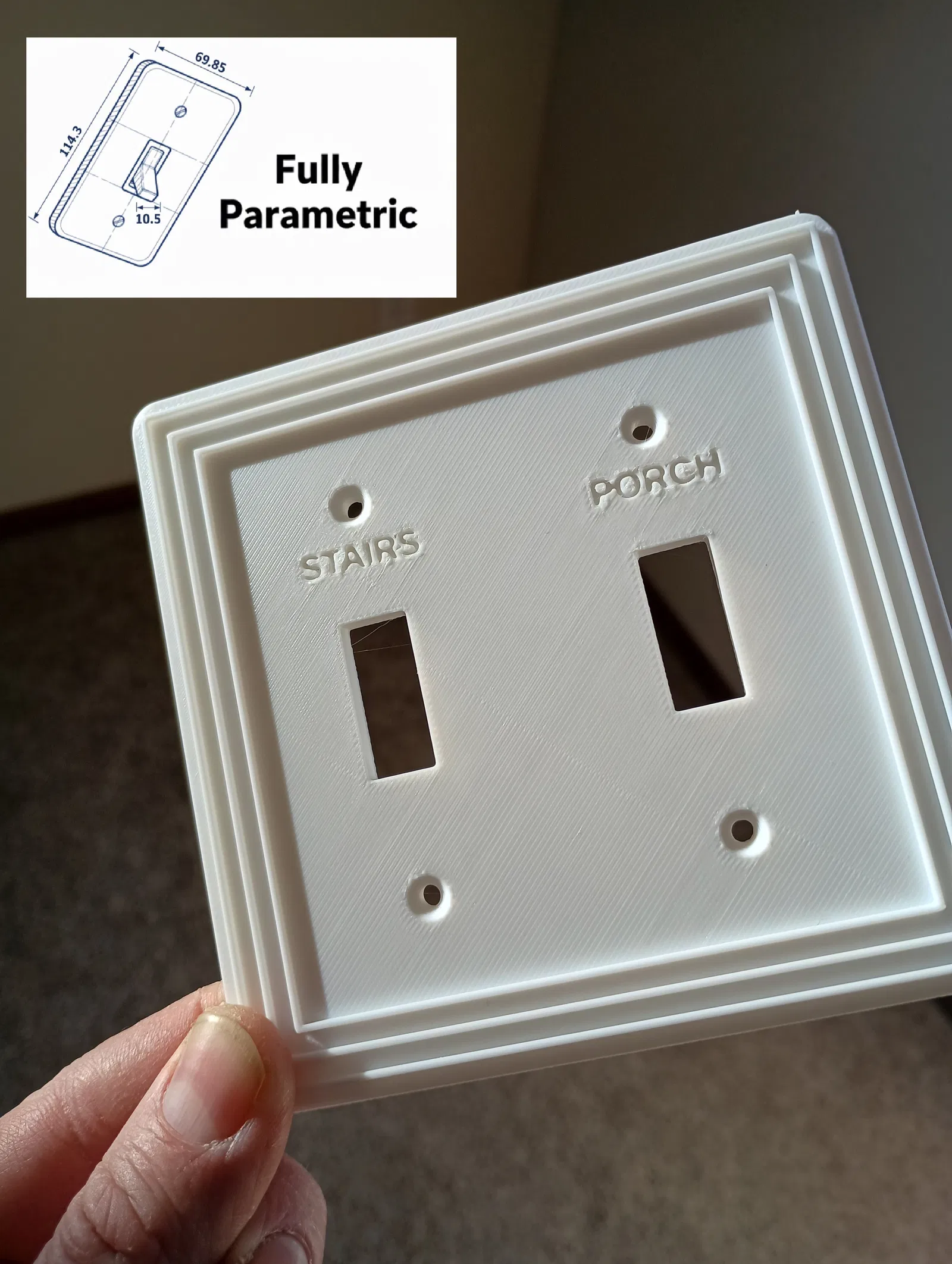 Mấy loại plate ốp tường phẳng in 3D kiểu tiêu chuẩn thường hay “fail” khi gặp thực tế. Ví dụ như hộp điện (electrical box) bị nhô ra khỏi tường thạch cao (drywall), hoặc bề mặt tường không phẳng hoàn toàn, là plate tiêu chuẩn hay bị hở khe hoặc bị lệch, nhìn không ngay hàng.