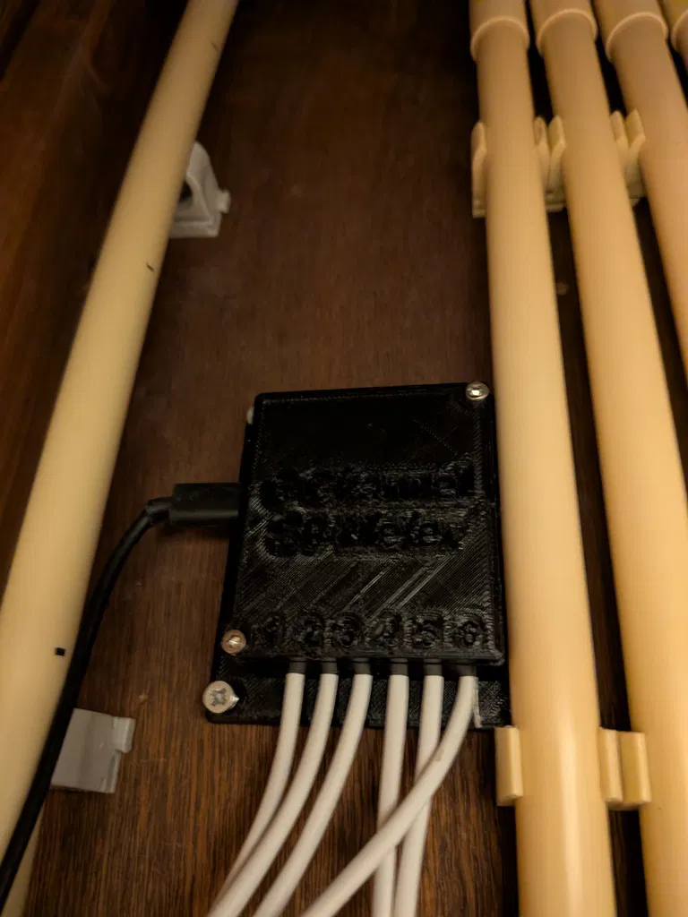 Vỏ case này chứa một board phát triển ESP32 để có thể dùng như một đồng hồ điện S0 với 6 kênh độc lập. Mình dùng board WEMOS Lolin32 Development nhưng nhiều board khác chắc cũng sẽ vừa (có thể cần chỉnh thiết kế chút xíu). Các điện trở pull-down cho 6 ngõ vào GPIO mà mình dùng được hàn ở mặt dưới của board. (Có thể hơi dư vì ESP32 có thể bật internal pull-ups, nhưng cẩn thận vẫn hơn). Hai lỗ bắt vít cho nắp dùng insert đồng M3 dạng ép nóng (cái của mình sâu 8mm nhưng sâu bao nhiêu cũng được). ESP32 đang chạy ESPHome và gửi số đo về Home Assistant. (mình sẽ kèm file YAML cho mẫu này)