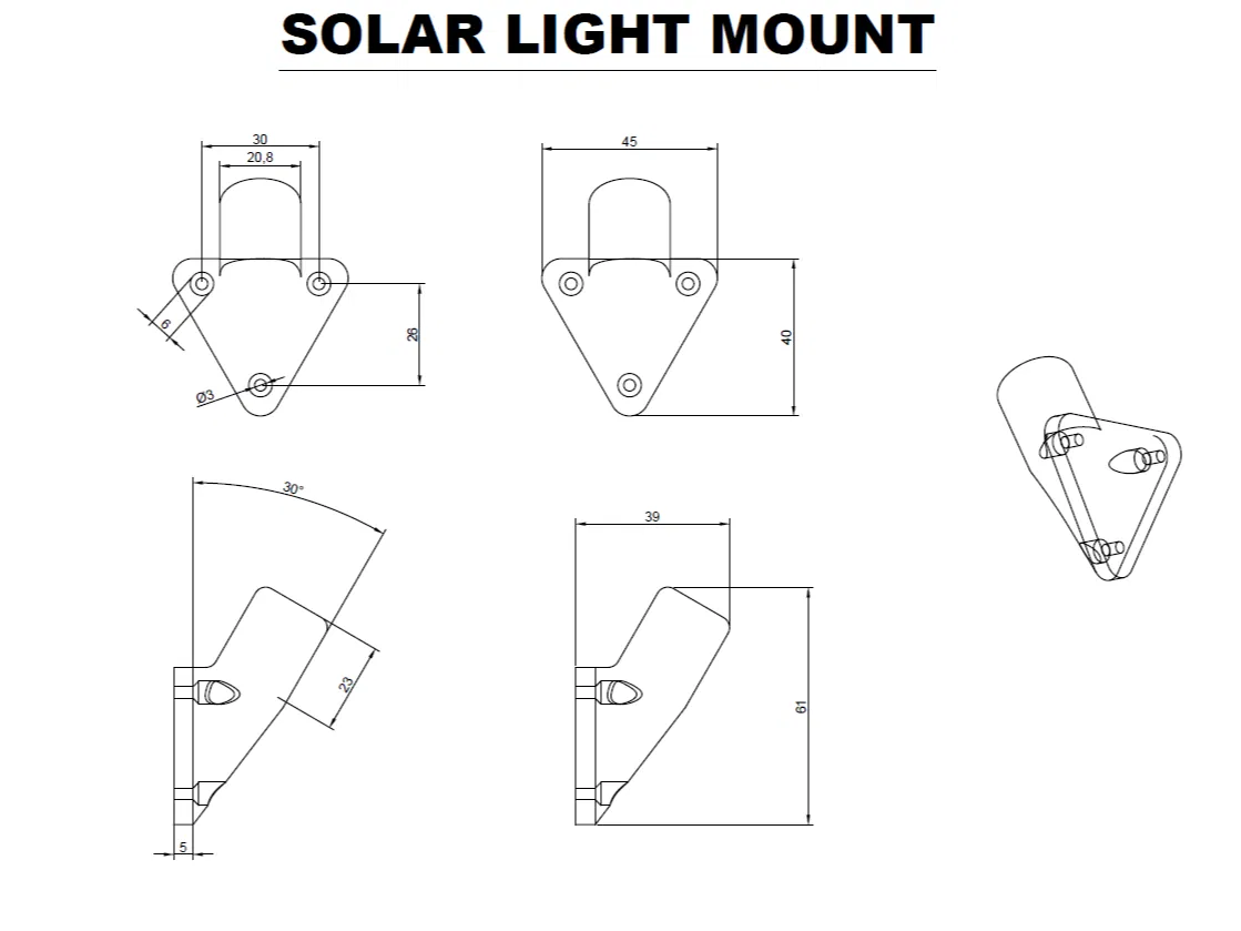 Giá đỡ giúp gắn cụm solar panel của đèn dây Fairy lên trụ hàng rào hoặc vách nhà kho, phù hợp cọc 20–21mm. Dùng 3 vít tự ren M3x15mm, chỉnh được góc xoay đến 90°. Dễ in, khuyến nghị PLA/PETG.