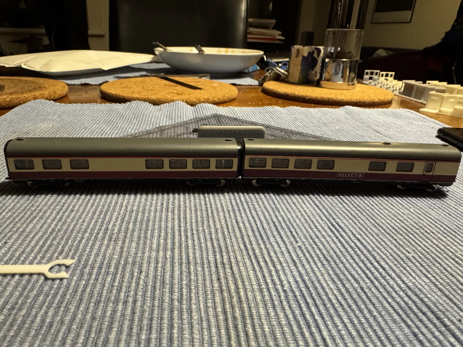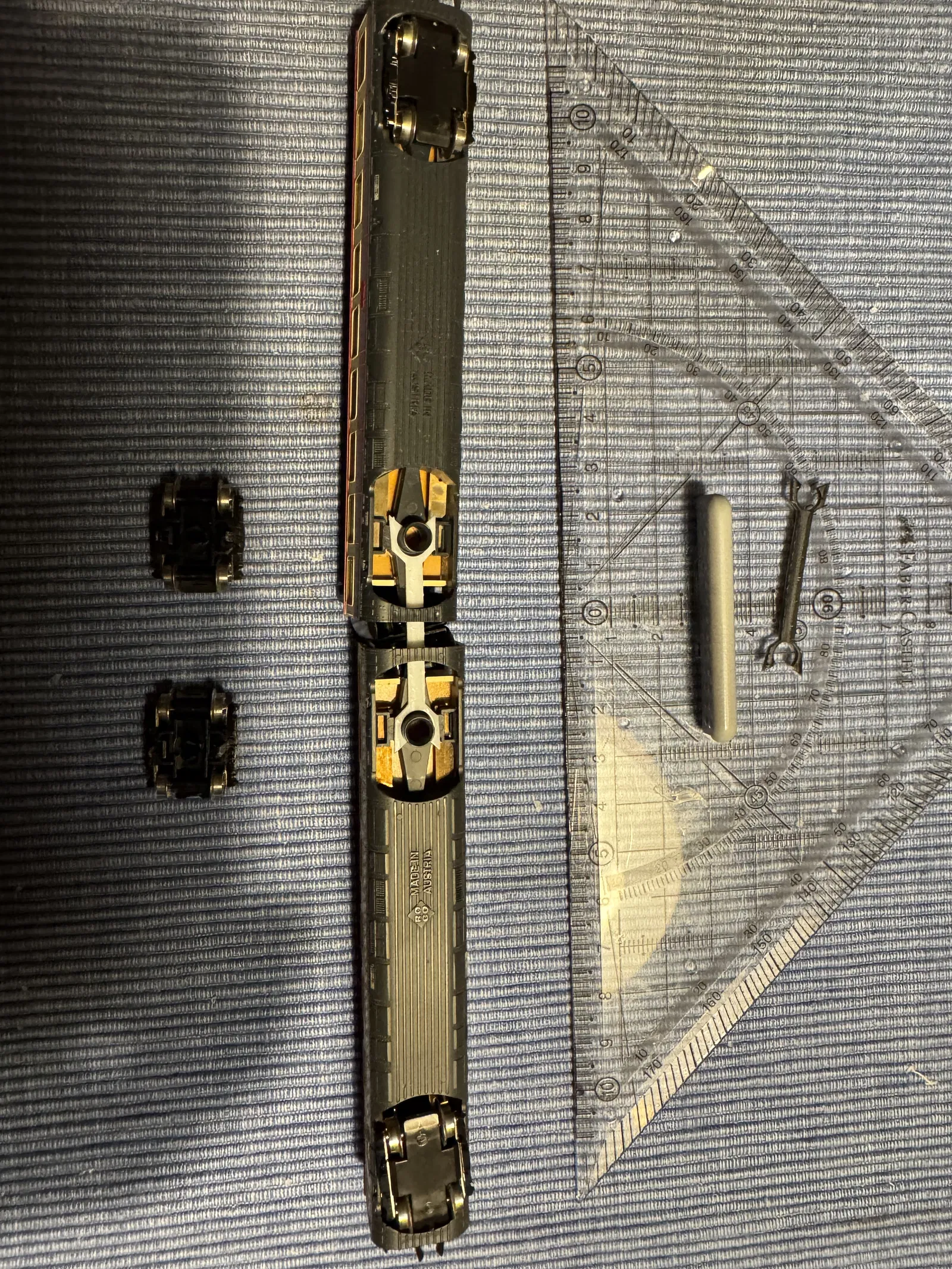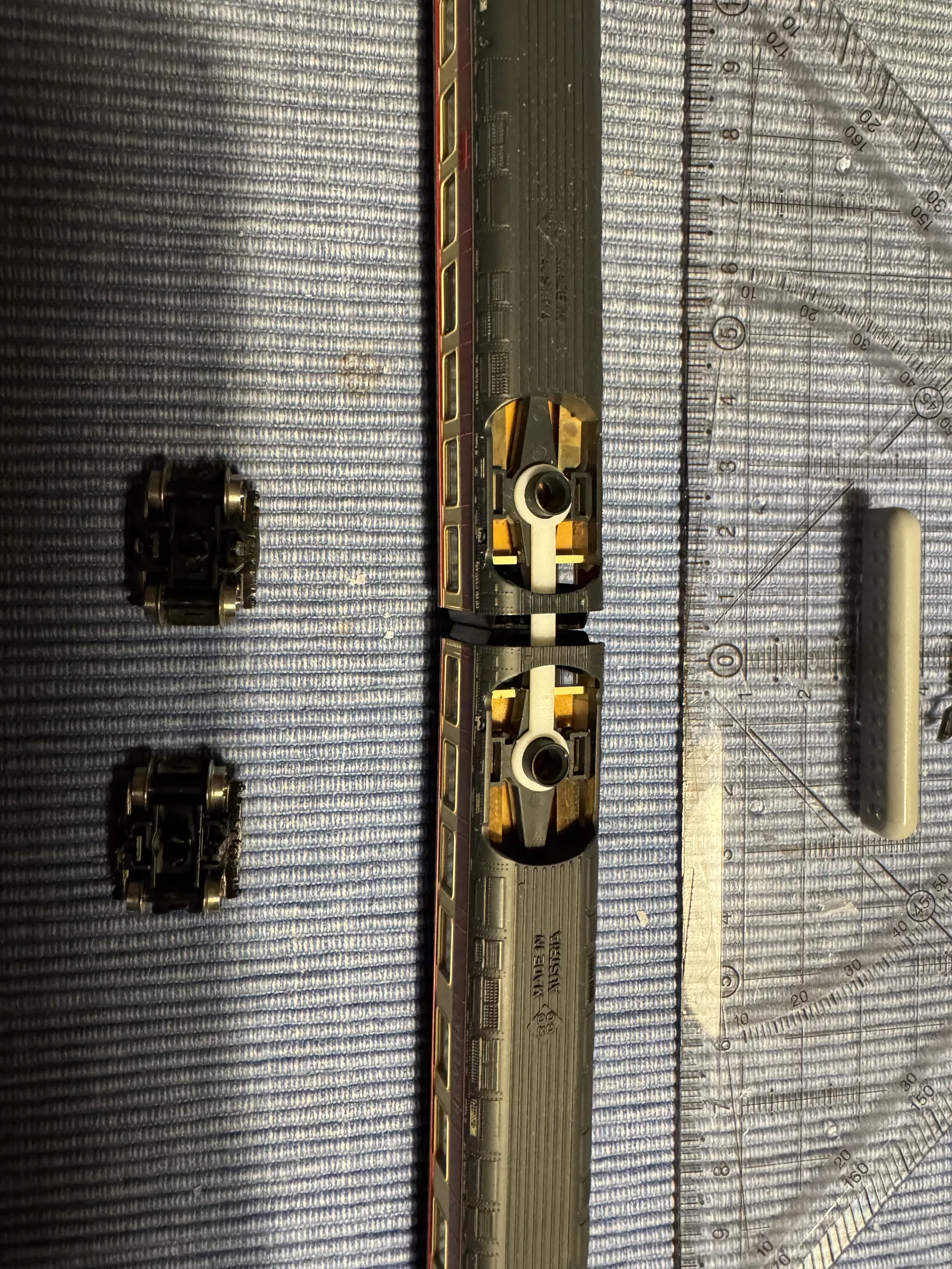 Sau khi lúc đặt lên ray thì cái khớp nối (coupling) zin giữa các toa hành khách bị bể, mà phụ tùng thay thế lại mắc một cách vô lý, mình tự thiết kế 2 cái khớp nối. Một cái là bản mô phỏng theo khớp nối nguyên bản để gắn vào (cắm vào) như zin, còn một cái là khớp nối cố định, chỉ lắp được khi đã tháo bộ bánh xe (wheelsets) ra trước.