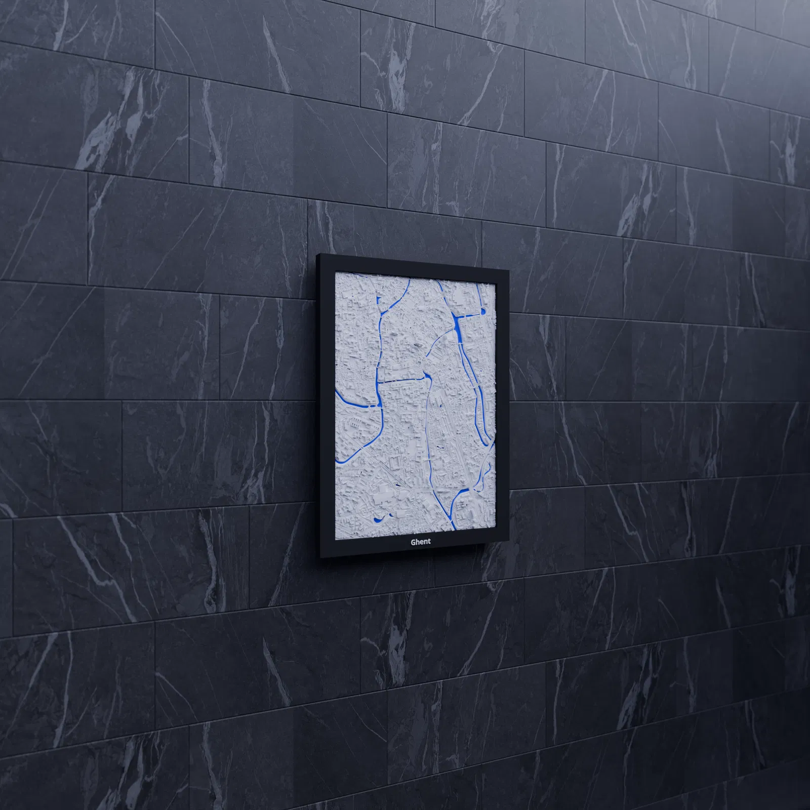 Bản thu nhỏ địa hình Gent (Bỉ) in 3D, dựng từ dữ liệu địa lý để tái hiện terrain chân thực. Khu vực 1.976×2.811 km được thu về 119.5×170.5 mm (xấp xỉ 16538:1), có sẵn khung và hướng dẫn lắp.