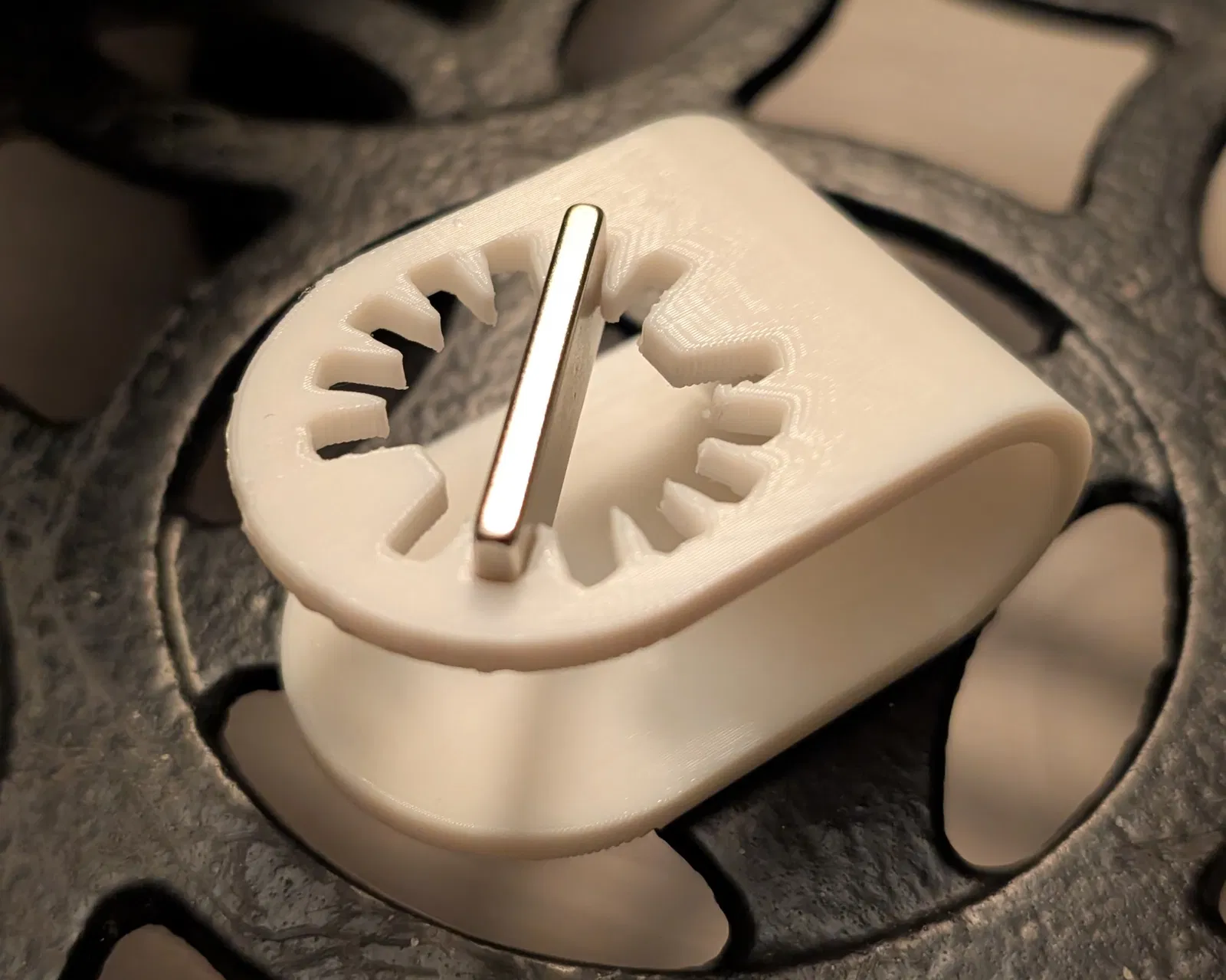 Mẫu giá đỡ nam châm nhỏ dùng cho sơn móng tay, thiết kế để gắn nam châm thanh neodymium 30×10×3mm. Khuyến nghị in đặt phần hông xuống build plate, cần support và infill cao để tăng độ bền.