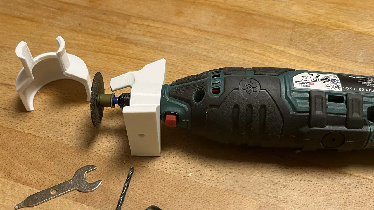 Mình thiết kế lại để vừa với máy Parkside (thương hiệu Lidl) AC Multi-Tool kiểu “Dremel”, đồng thời bổ sung thêm vài tính năng.