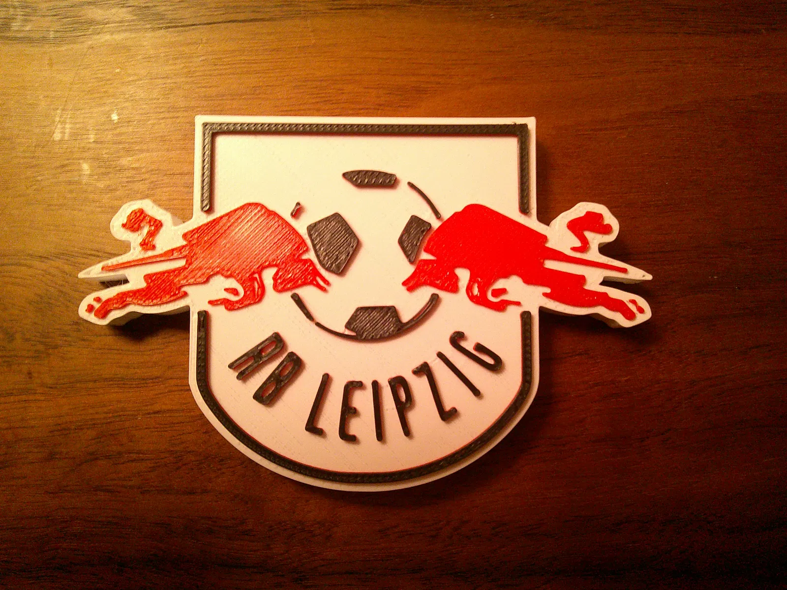 Mẫu lót ly hoặc bảng trang trí logo RB Leipzig. In theo từng lớp màu: trắng tới 6.2mm, đỏ tới 6.8mm, rồi hoàn thiện với màu đen để ra đúng logo rõ nét, hợp làm coaster hoặc plaque.