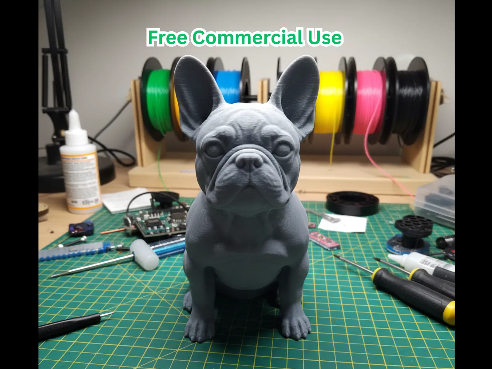 Tượng French Bulldog này tái hiện đúng dáng vẻ đặc trưng của giống chó trong tư thế ngồi. Model được thiết kế dạng đặc, không kèm đế; hình minh hoạ cho thấy rõ các đường layer và bối cảnh bàn làm việc lộn xộn để nhấn mạnh cảm giác “in FDM ngoài đời” chân thật.