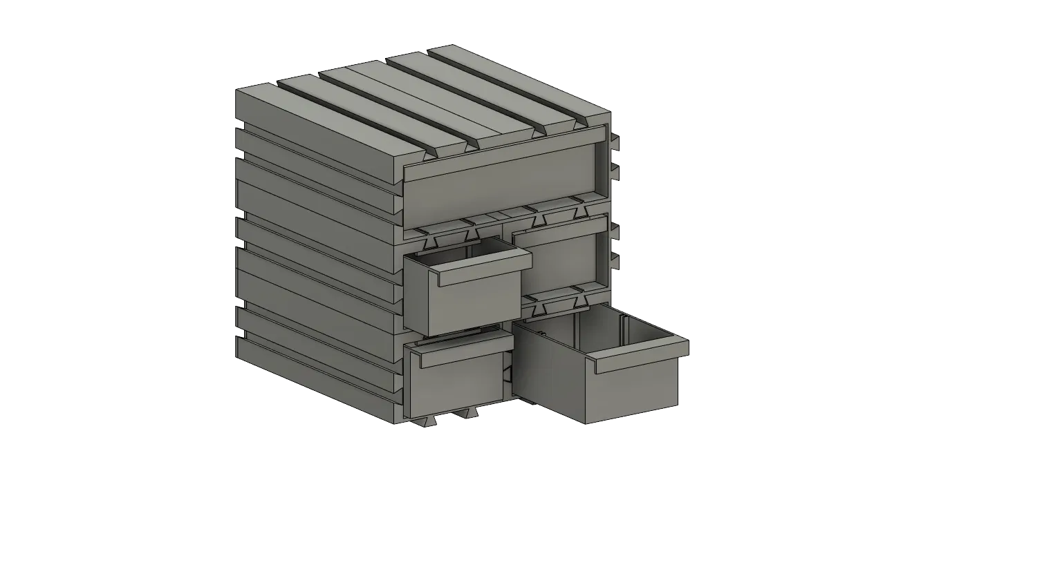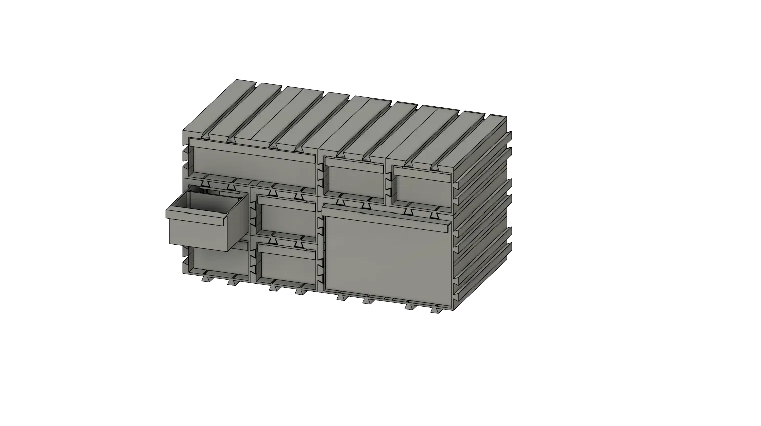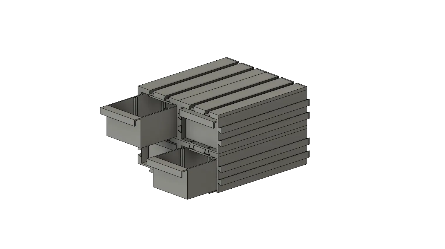 Đây là một thiết kế hệ thống lưu trữ dạng mô-đun (modular) dành cho 3D printing. Hệ thống có các chi tiết liên kết (interlocking) giúp sắp xếp linh hoạt và dễ mở rộng. Mỗi mô-đun gồm một khung chắc chắn dạng mở hai đầu, bên trong có các rãnh dẫn hướng (internal rails) được thiết kế chuẩn xác để cố định và dẫn các ngăn kéo trượt tương ứng. Bản thân các khung còn có cơ chế liên khóa trên–dưới (top & bottom interlocking mechanism) rất tiện, giúp bạn chồng và nối nhiều khối theo cả chiều dọc lẫn chiều ngang một cách nhẹ nhàng, tạo cấu hình lưu trữ tùy biến phù hợp mọi không gian.
